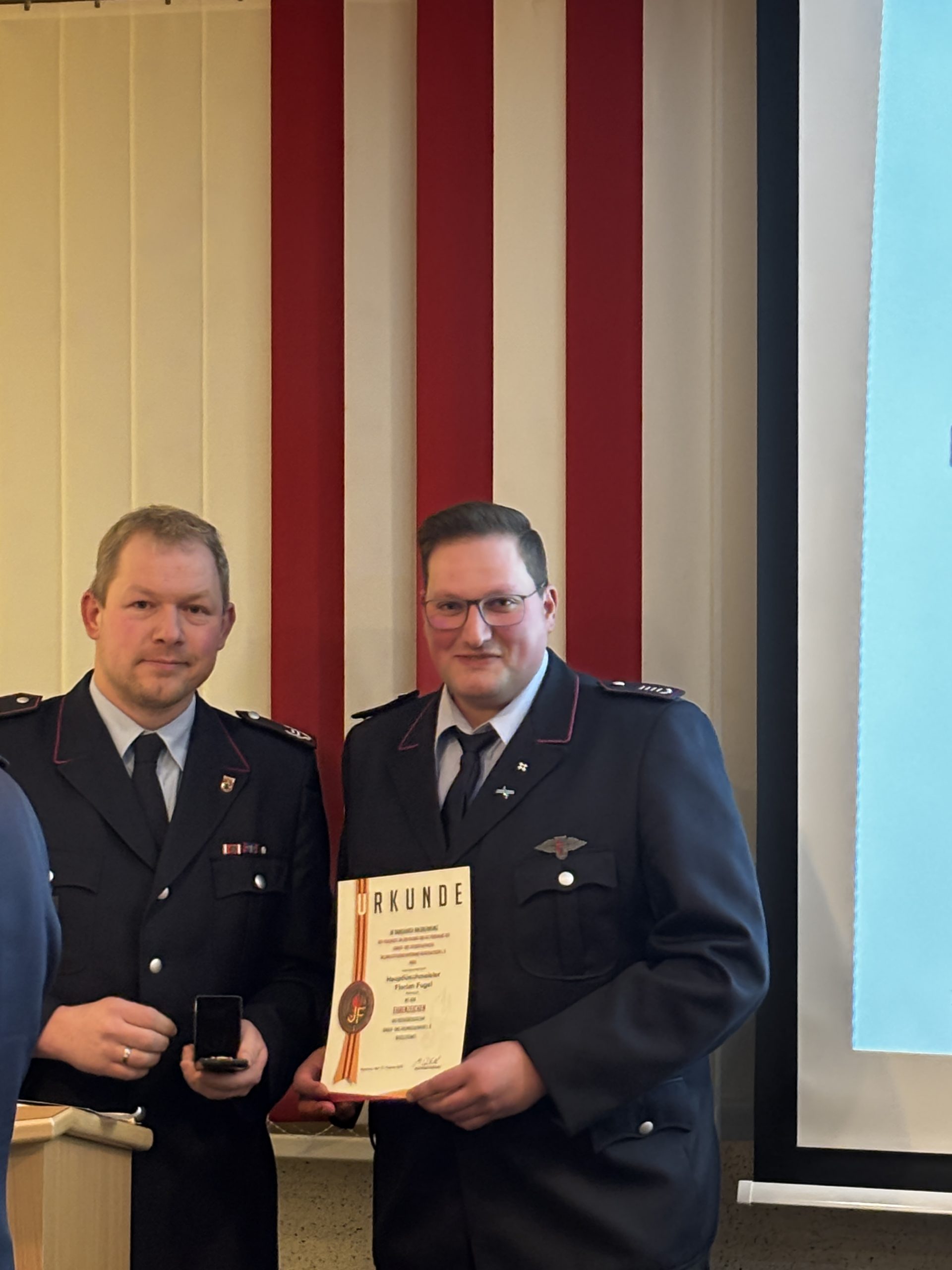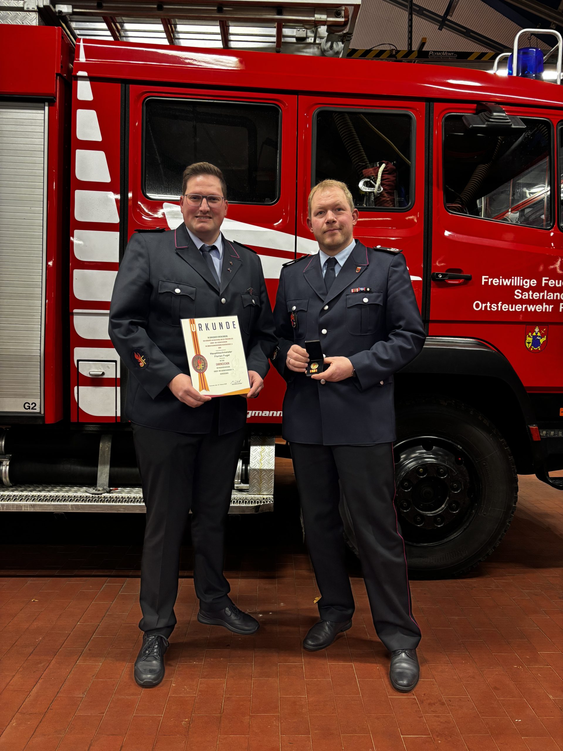 Eine besondere Ehrung erhielt Jugendfeuerwehrwart Florian Fugel: Ihm wurde das Ehrenzeichen der Niedersächsischen Kinder- und Jugendfeuerwehr, durch den Stellvertretenden Kreisjugendfeuerwehrwart Jan Wasserthal verliehen.