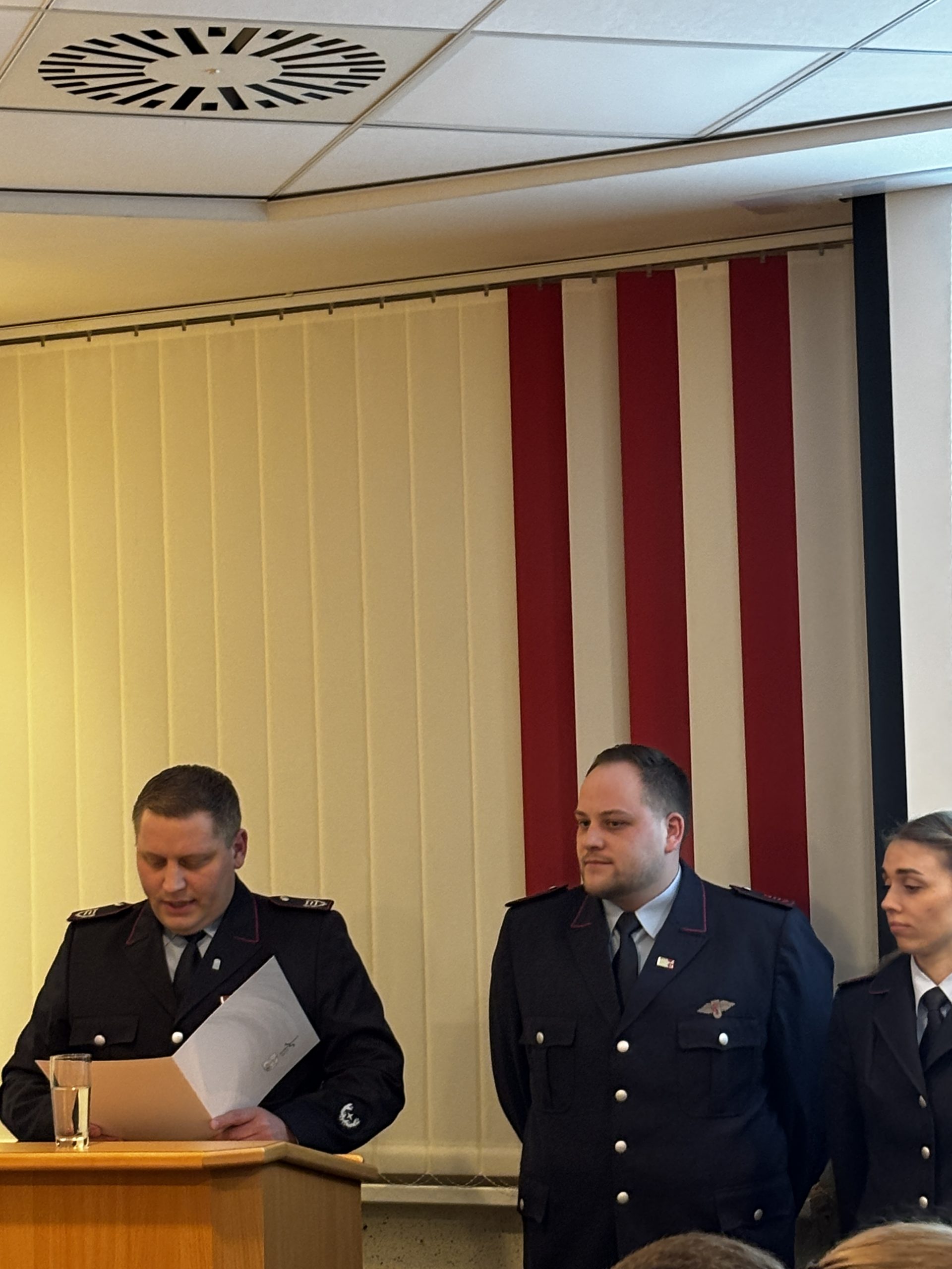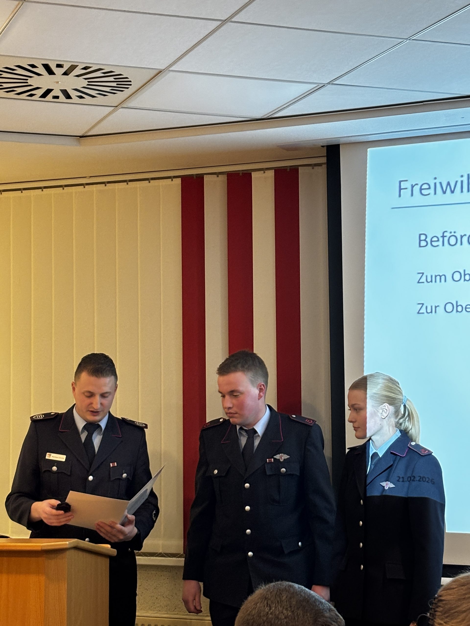 Zum Brandmeister beziehungsweise zur Brandmeisterin wurden Kevin Frerichs, Julia Meyer und Martin Sobing befördert. Ralf Bloedorn, Torsten Brinkmann und Christian Henken erhielten den Dienstgrad Hauptbrandmeister. Die Beförderungen übernahm Gemeindebrandmeister Matthias Pörschke.
