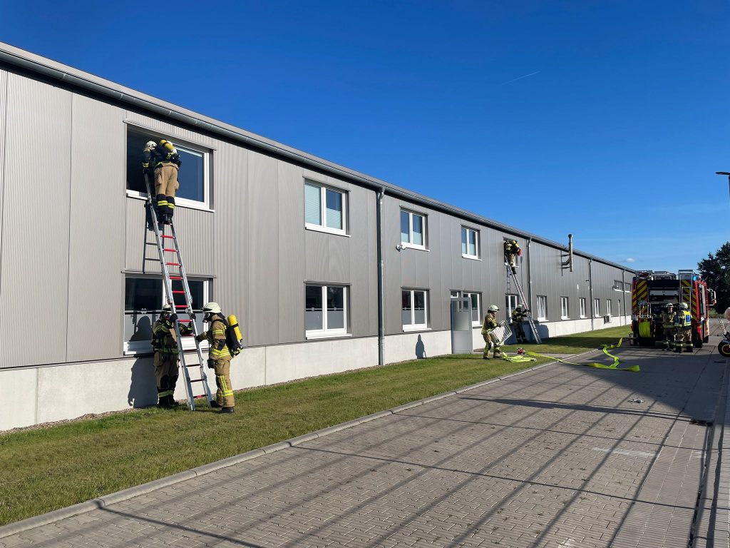 🔥 Aufgaben der Übung: ☑️ Menschenrettung aus den Gebäuden ☑️ Brandbekämpfung innerhalb der Produktionshalle ☑️ Aufbau der Wasserversorgung für die Innenbrandbekämpfung ☑️ Riegelstellung zum Verwaltungsgebäude ☑️ Wasserversorgung über eine lange Wegstrecke