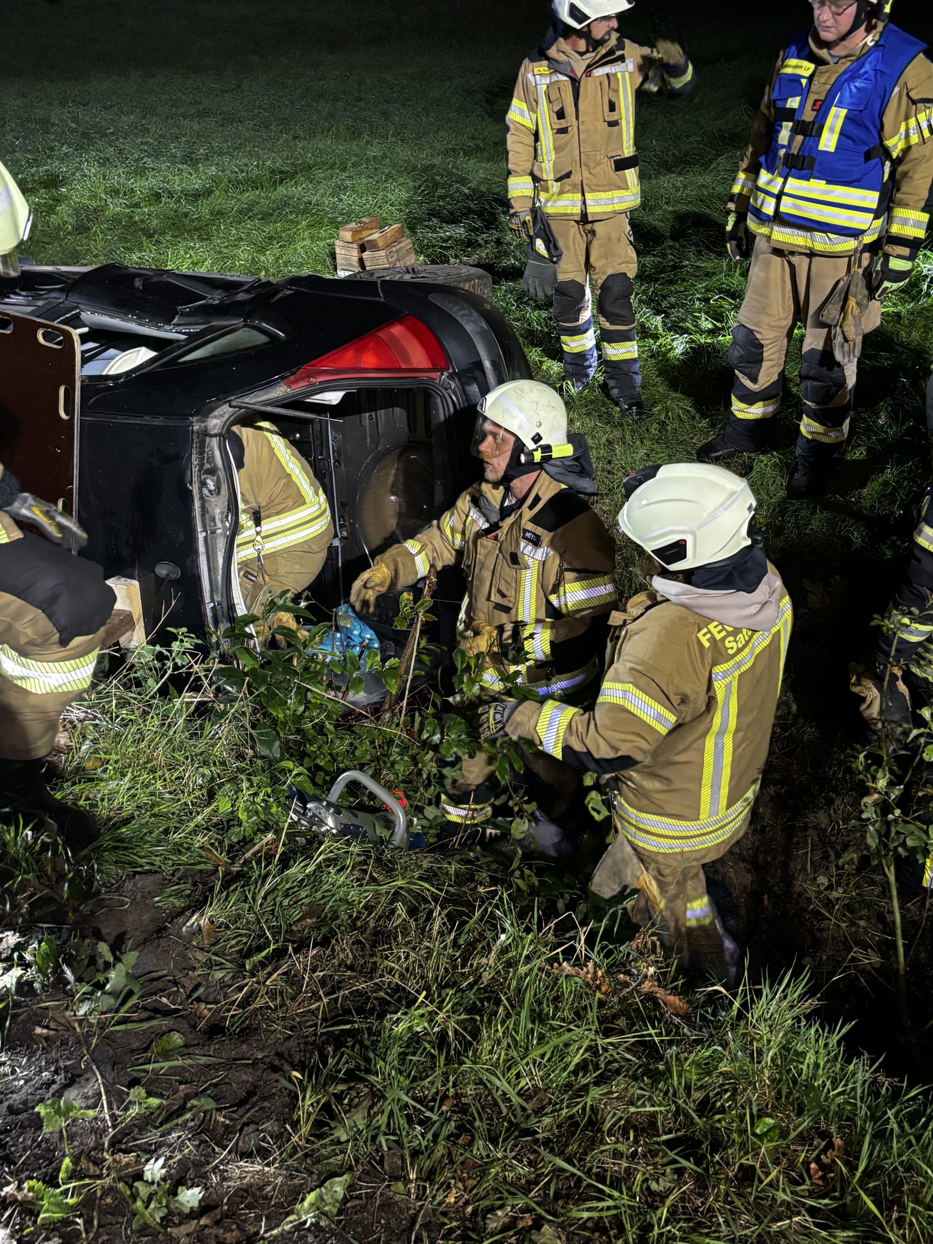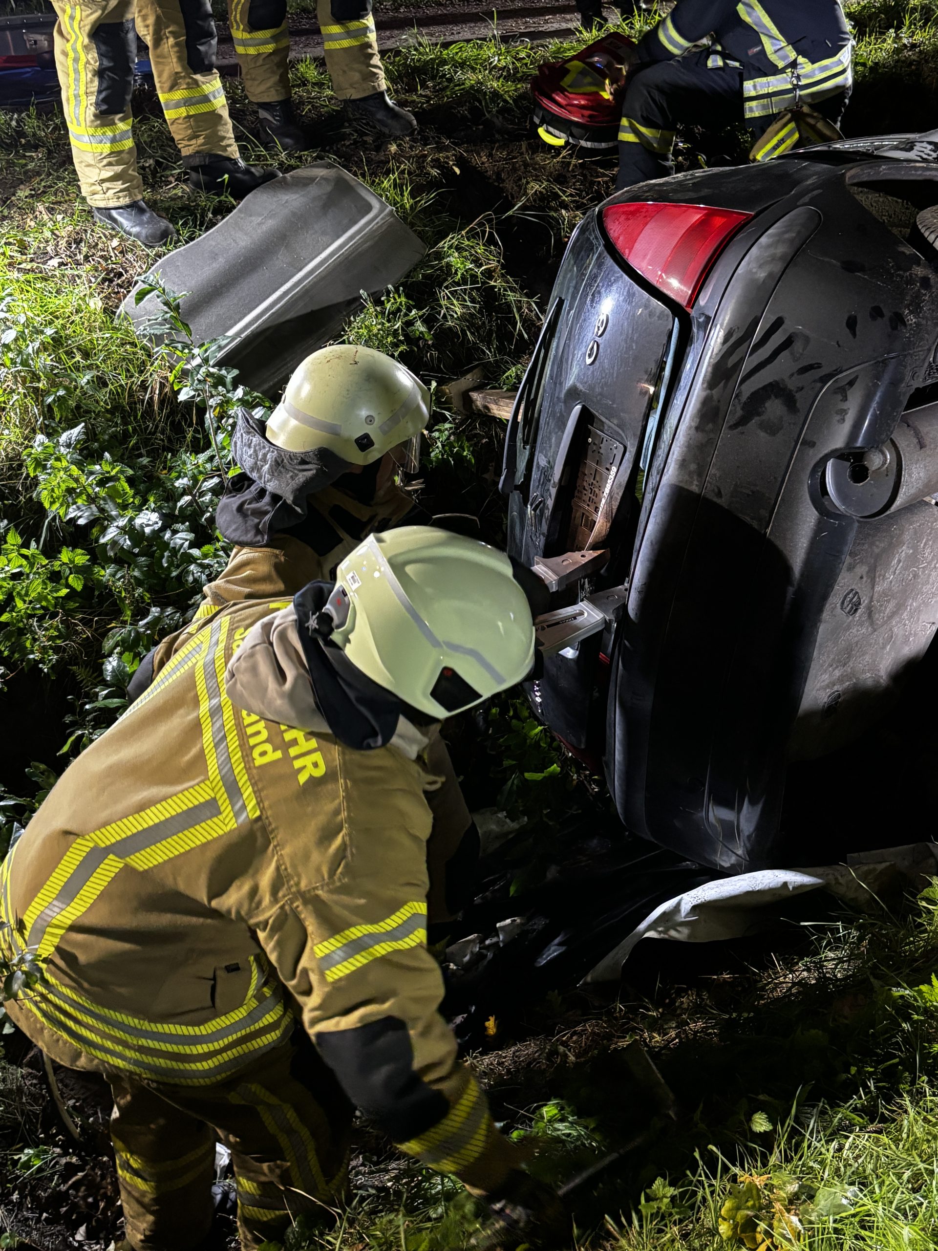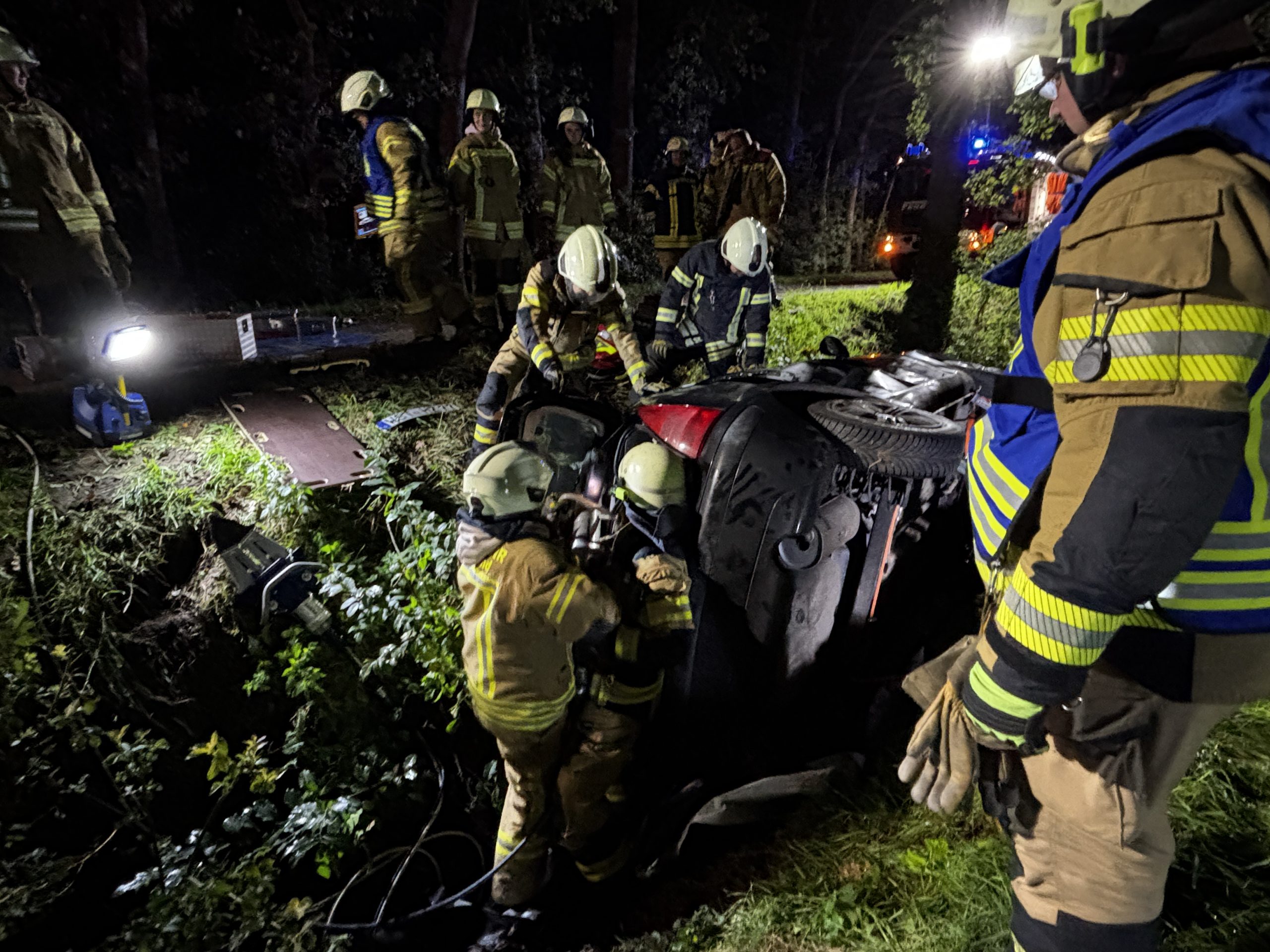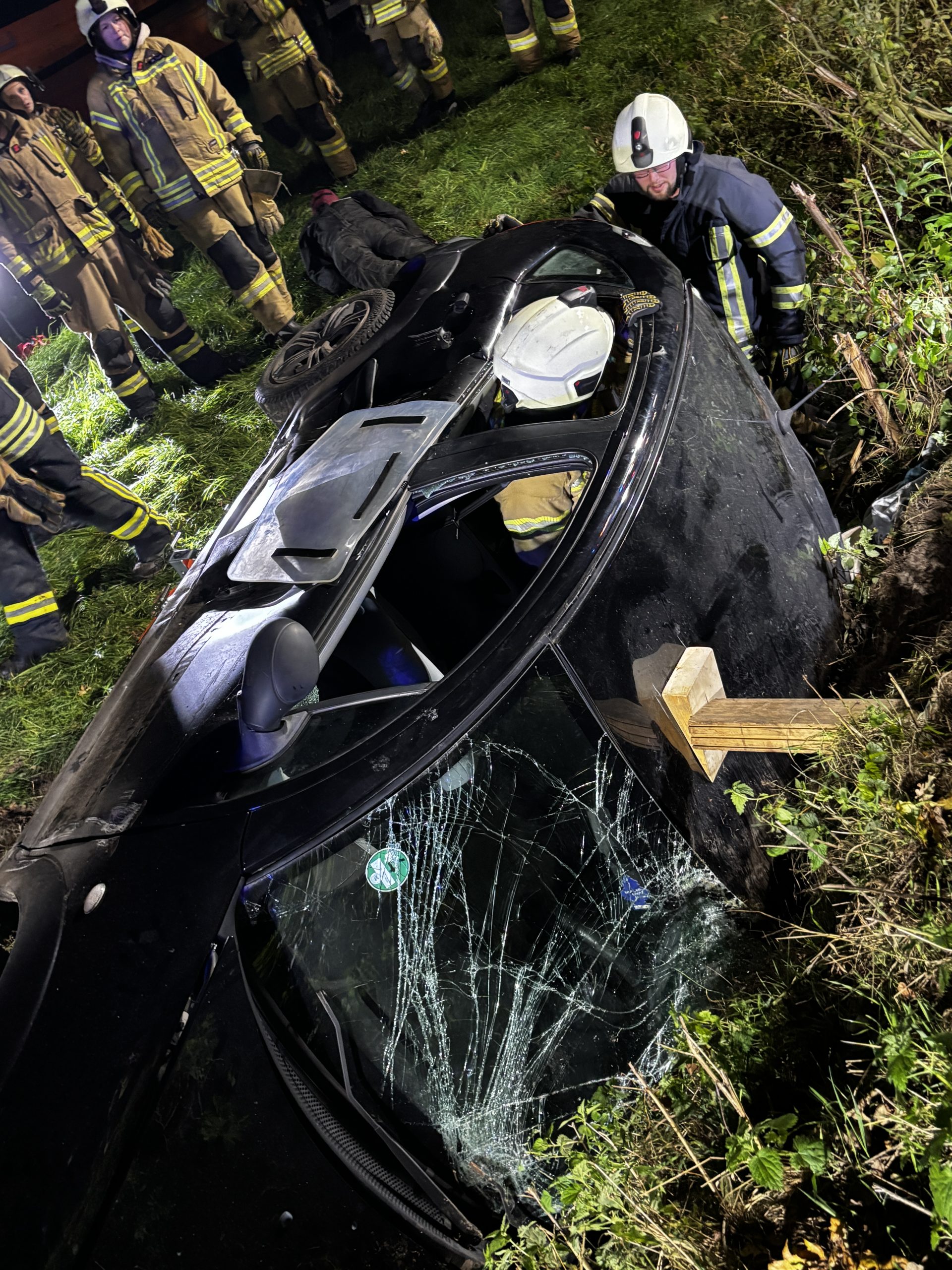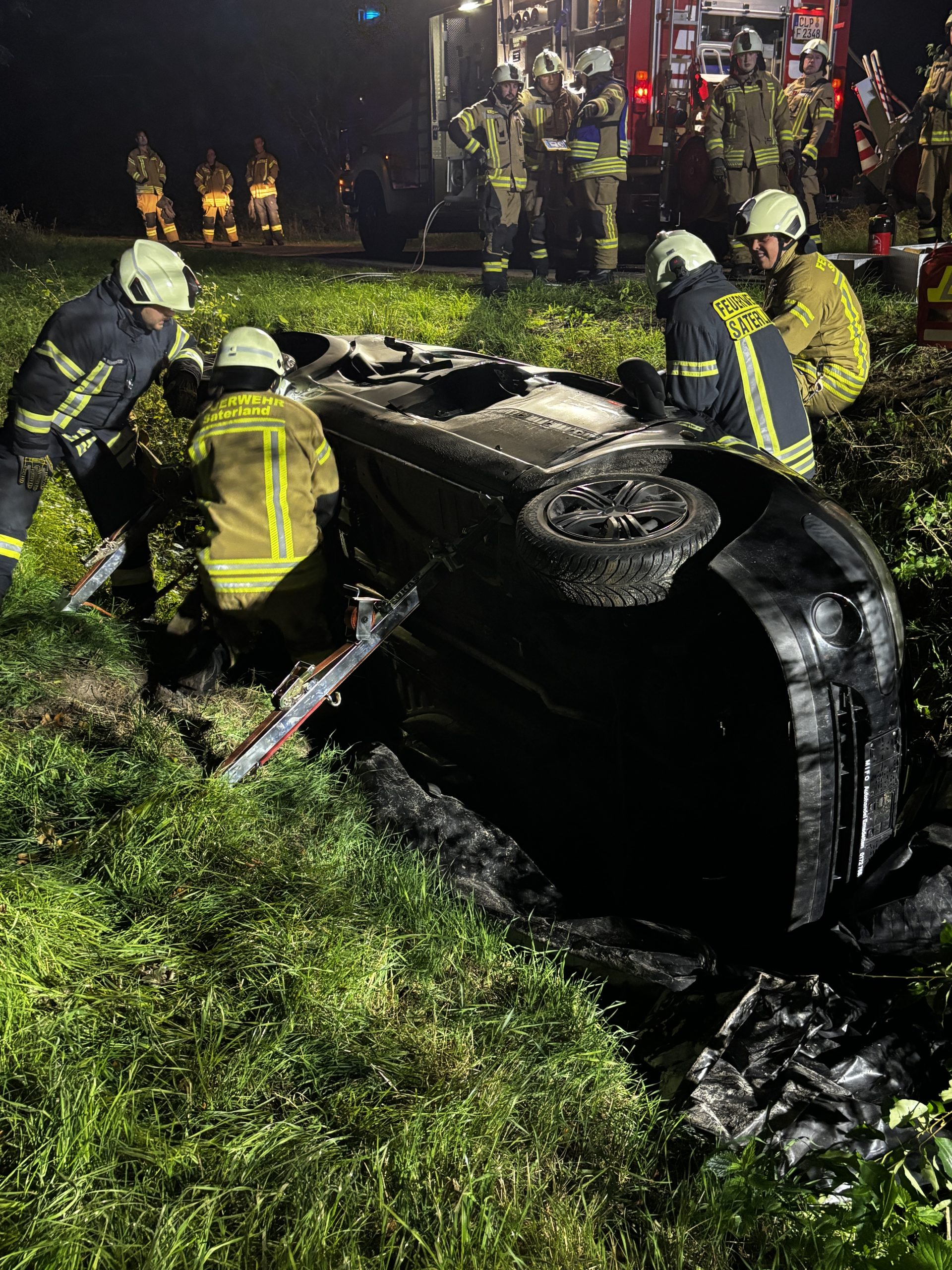 Übungslage: Ein PKW lag im Graben, eine Person war im Fahrzeug eingeklemmt.