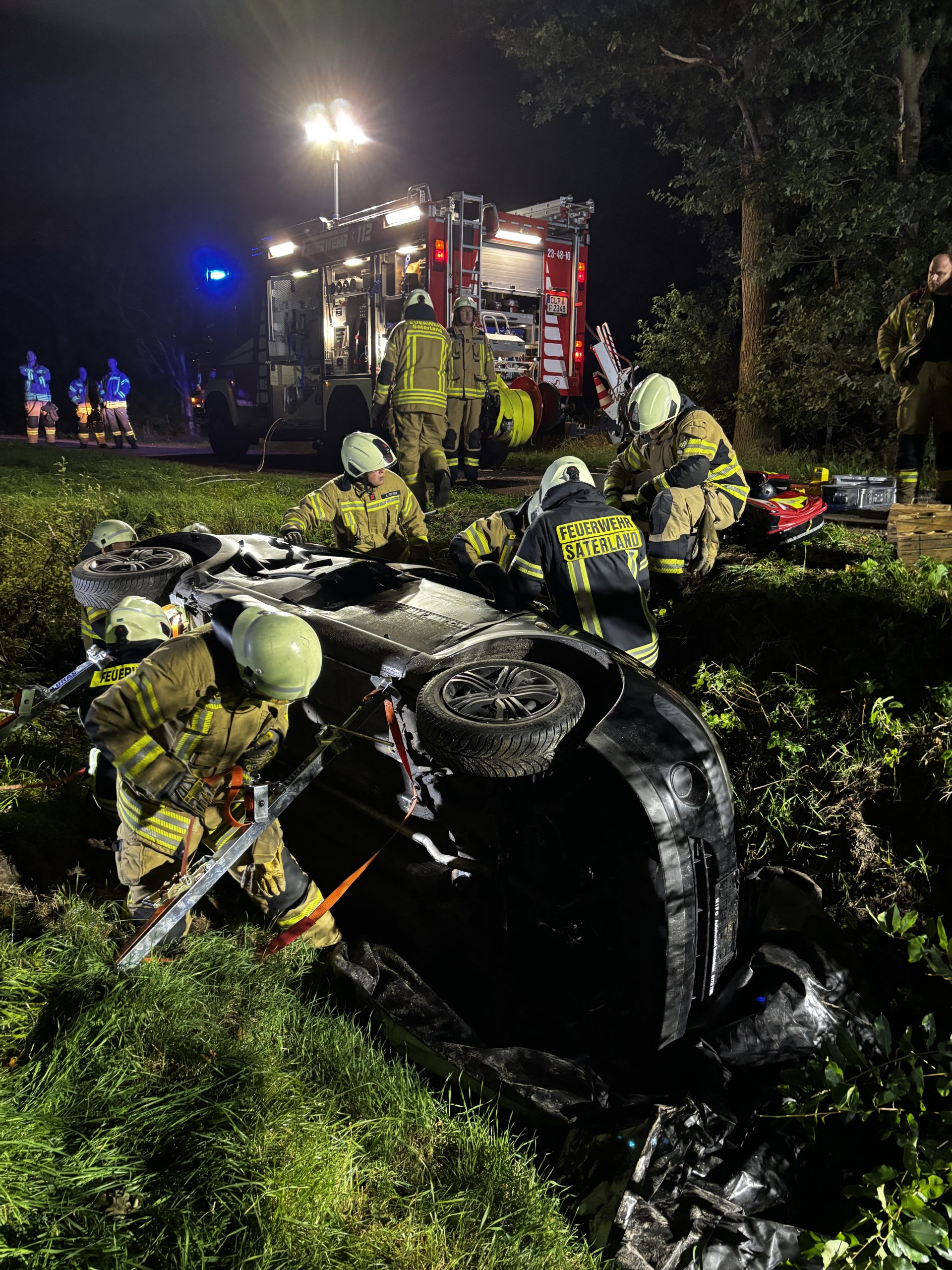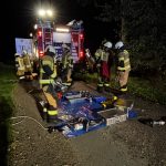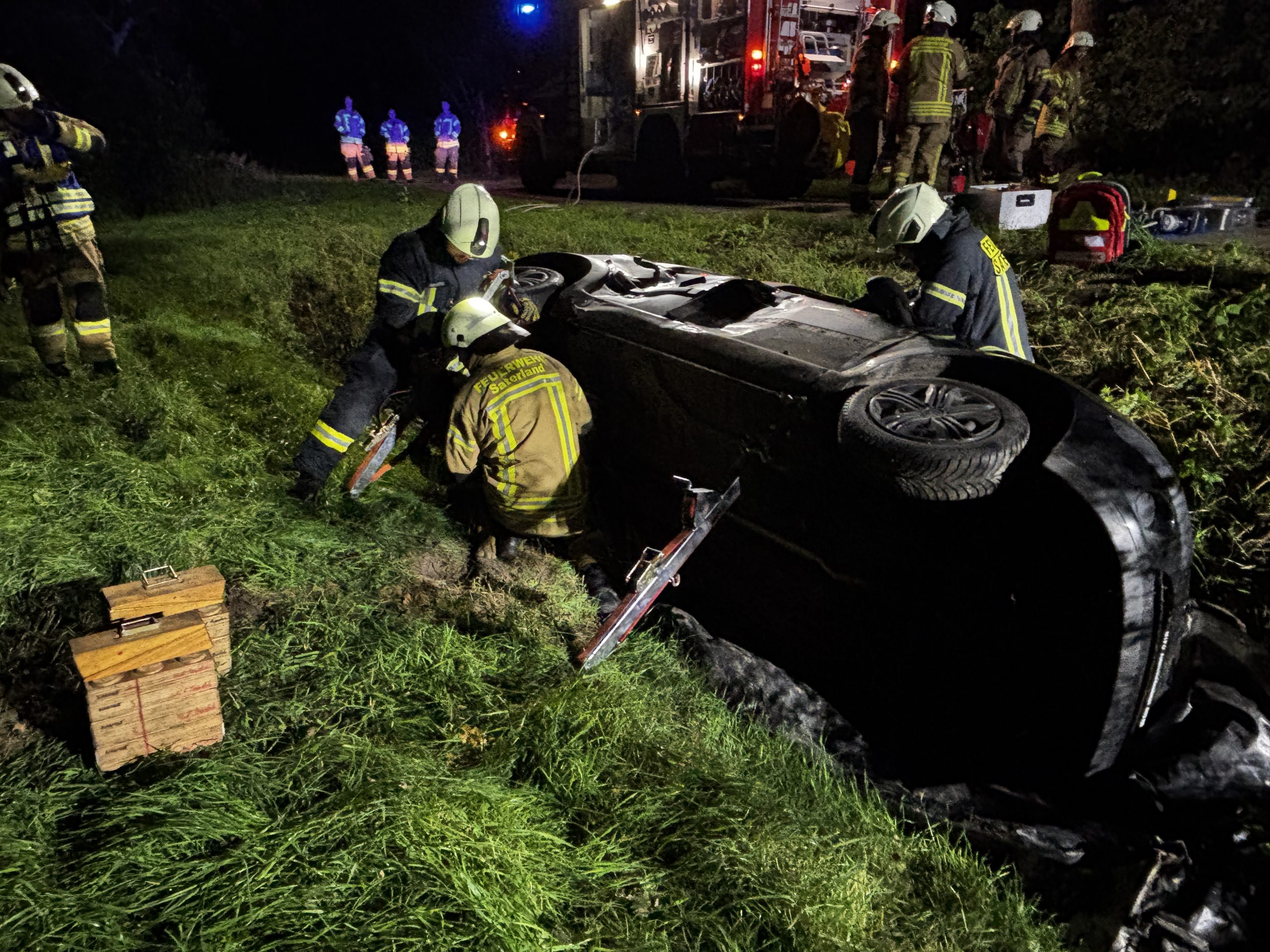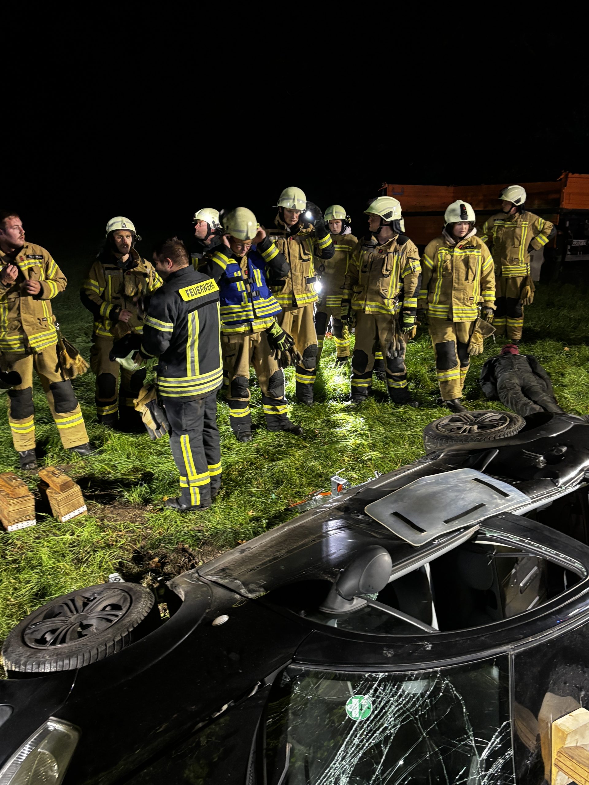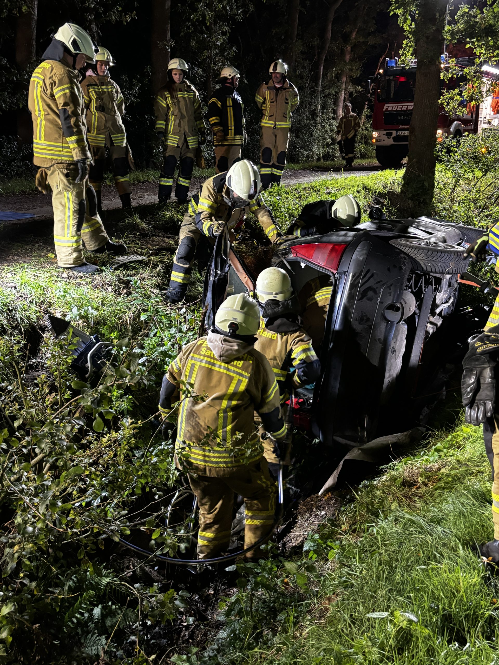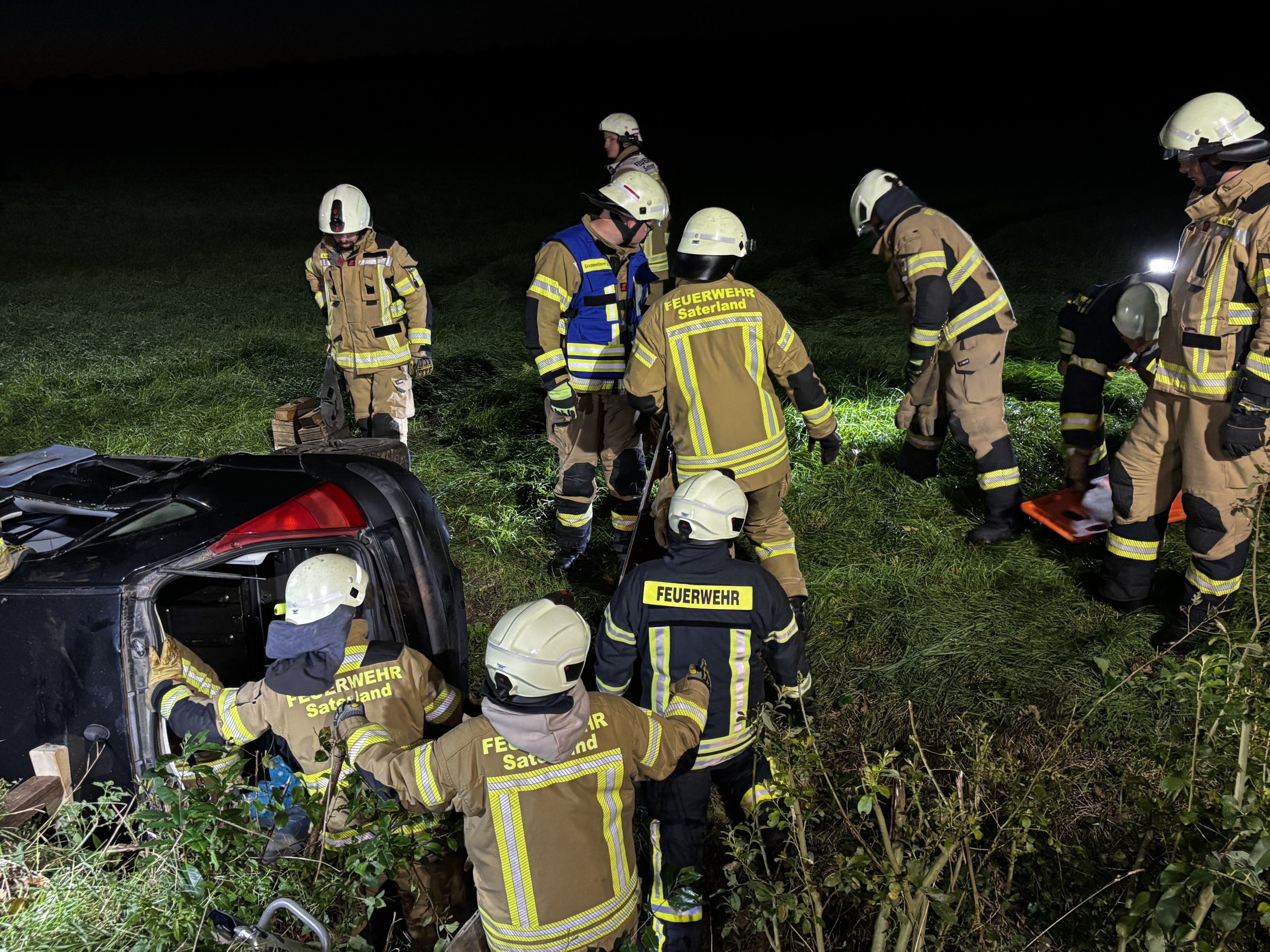 Übungslage: Ein PKW lag im Graben, eine Person war im Fahrzeug eingeklemmt.