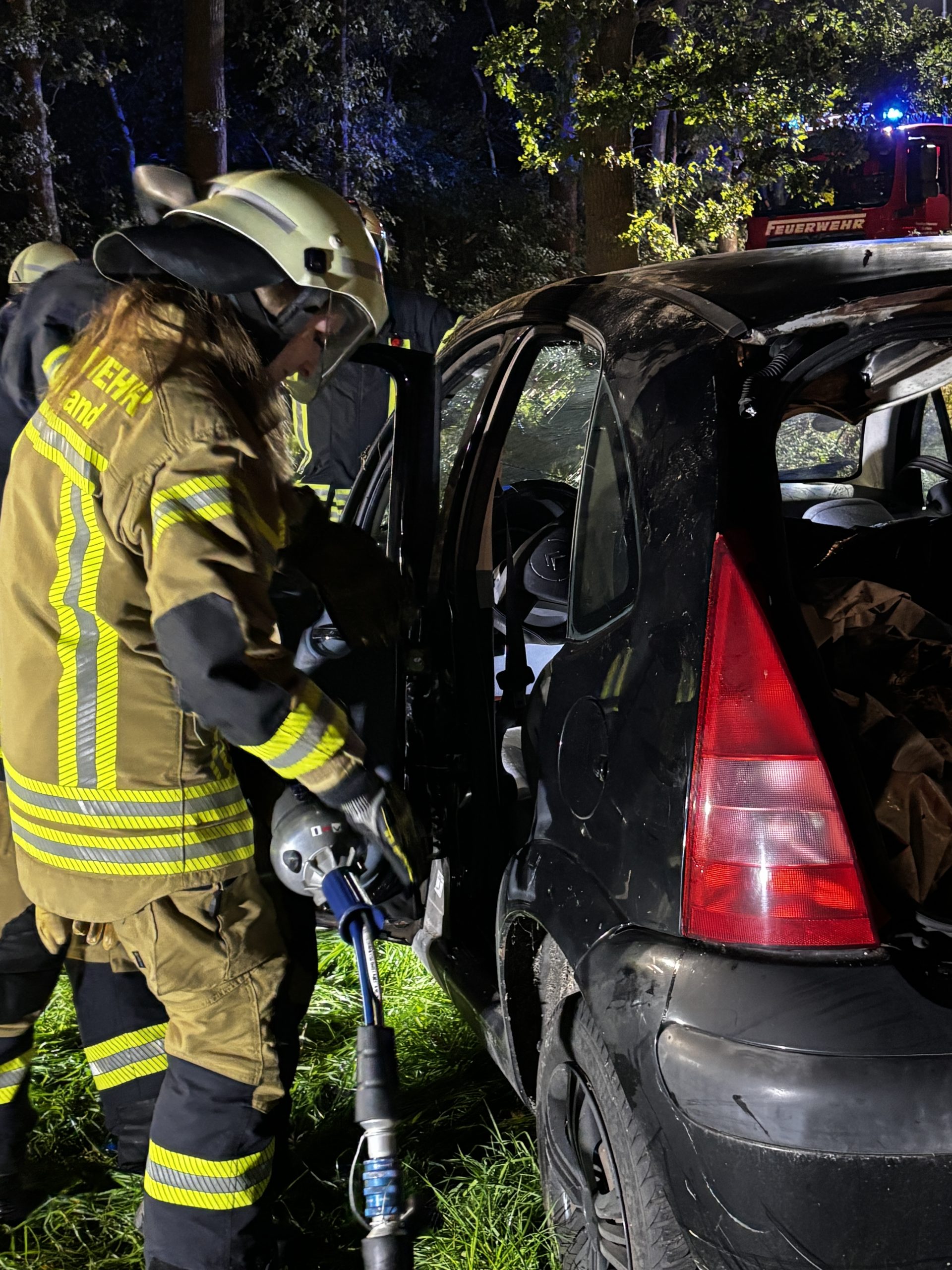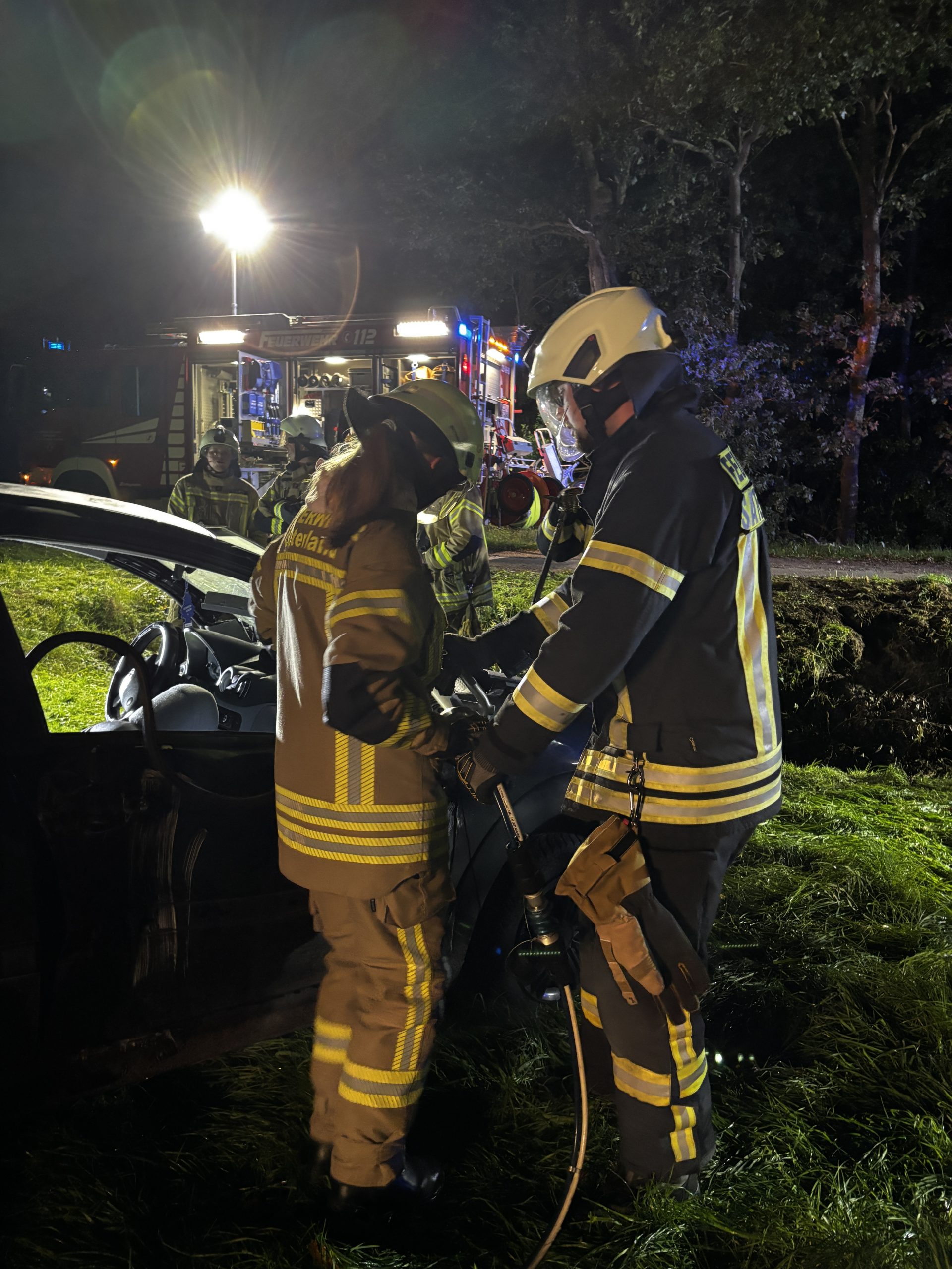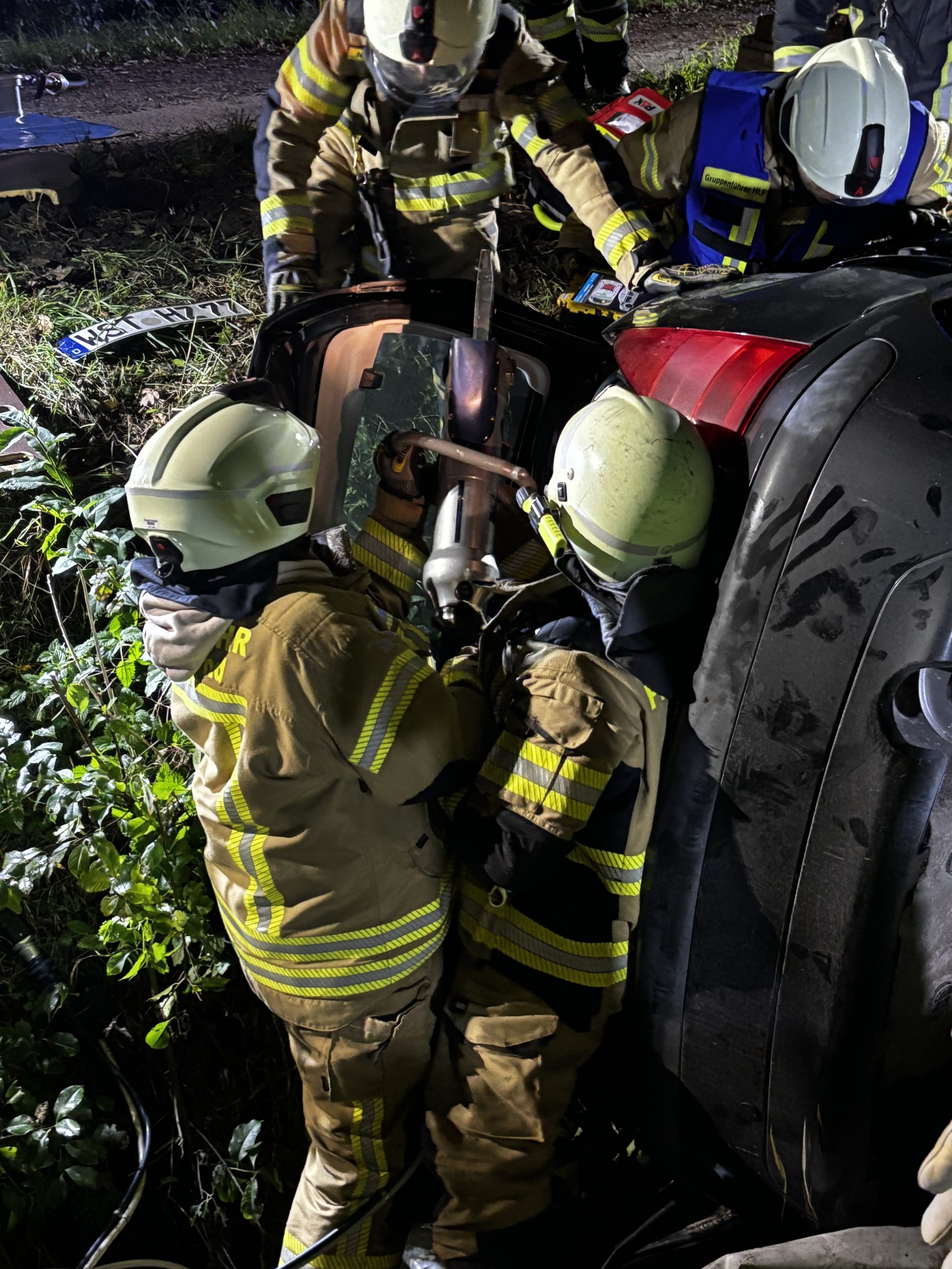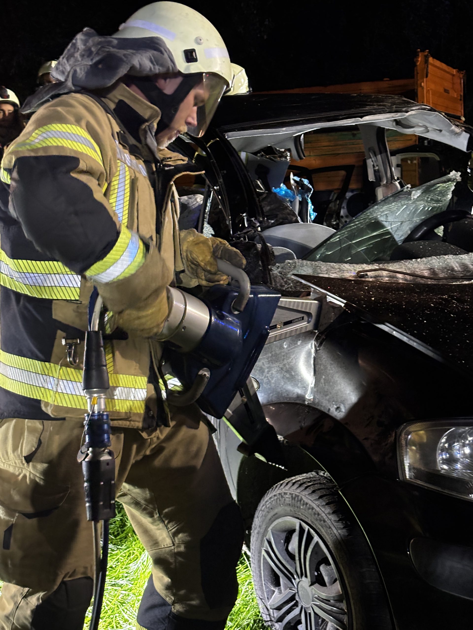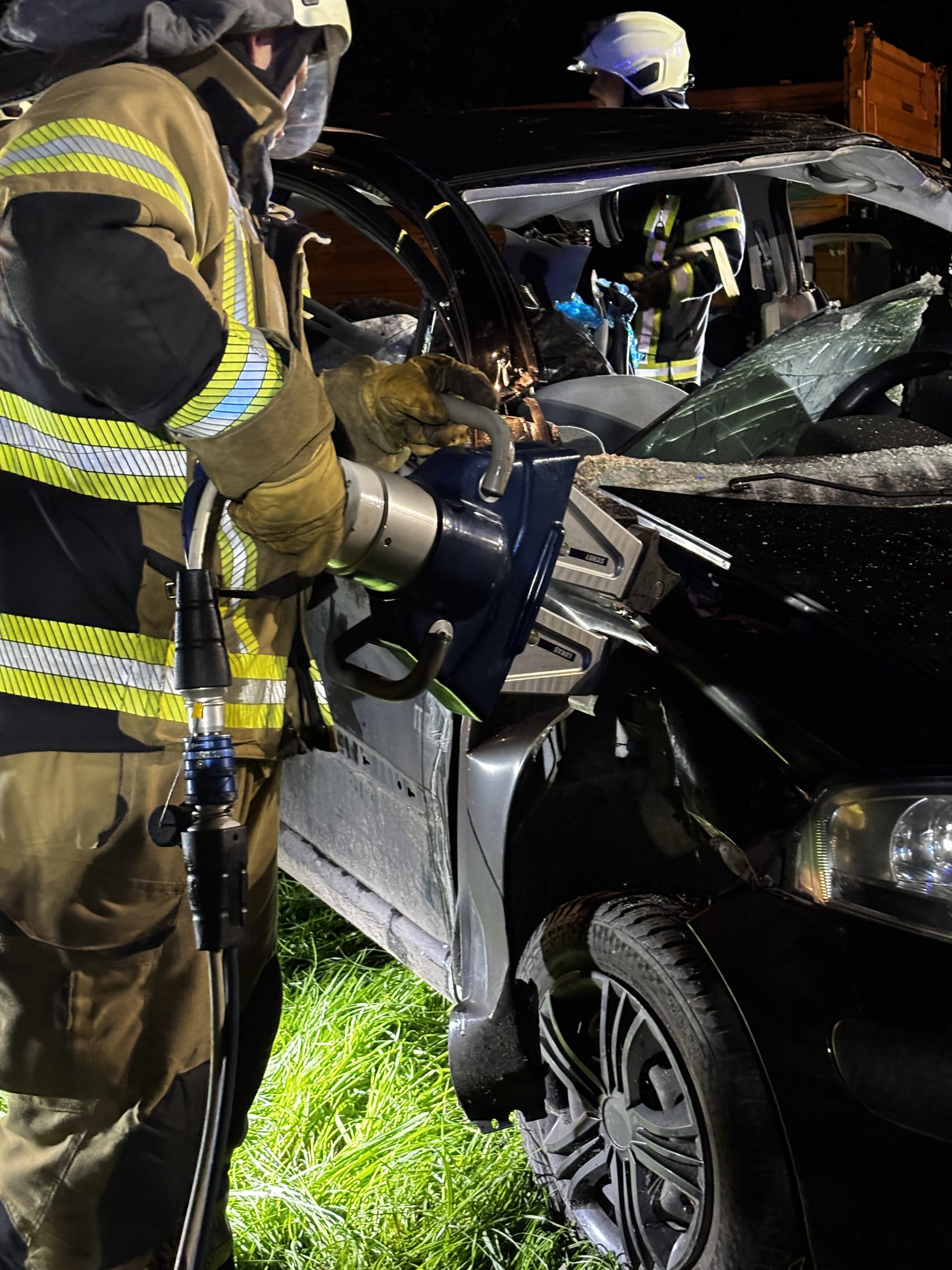 Um die Person patientengerecht befreien zu können, musste das Fahrzeug zunächst abgestützt und die Einsatzstelle großflächig ausgeleuchtet werden. Anschließend öffneten wir mit Schere und Spreizer den Kofferraumdeckel, um an die verunfallte Person zu gelangen.