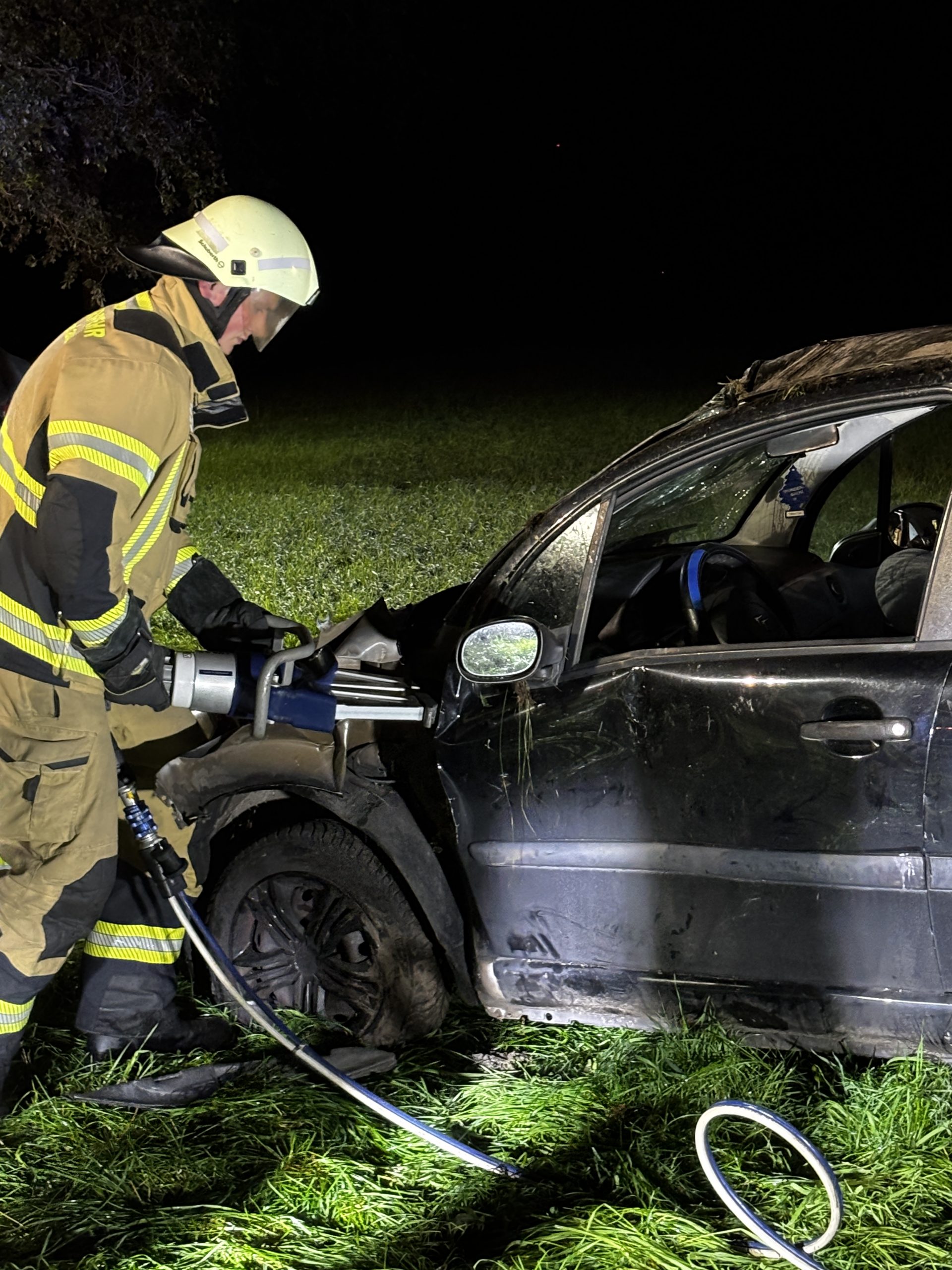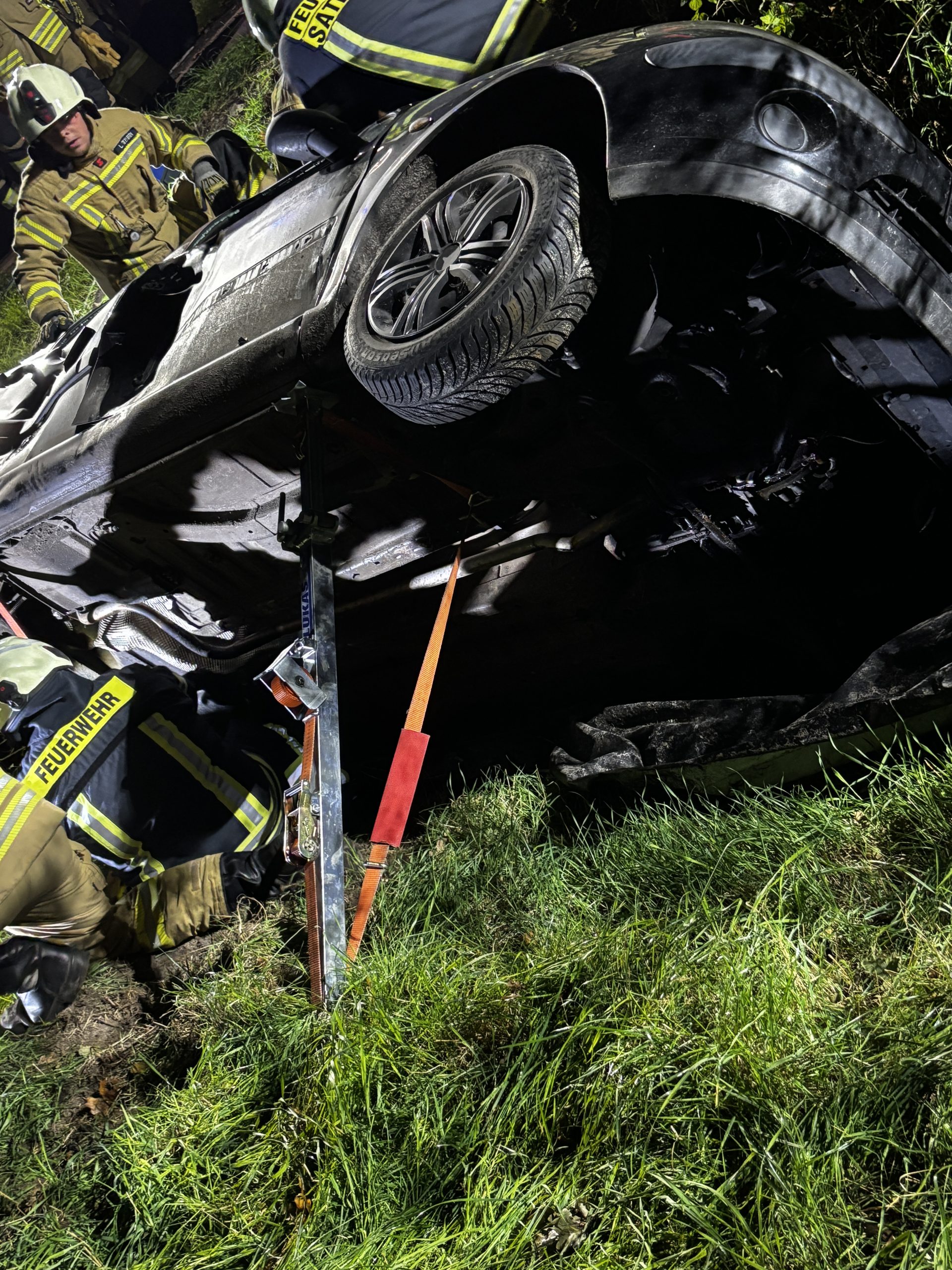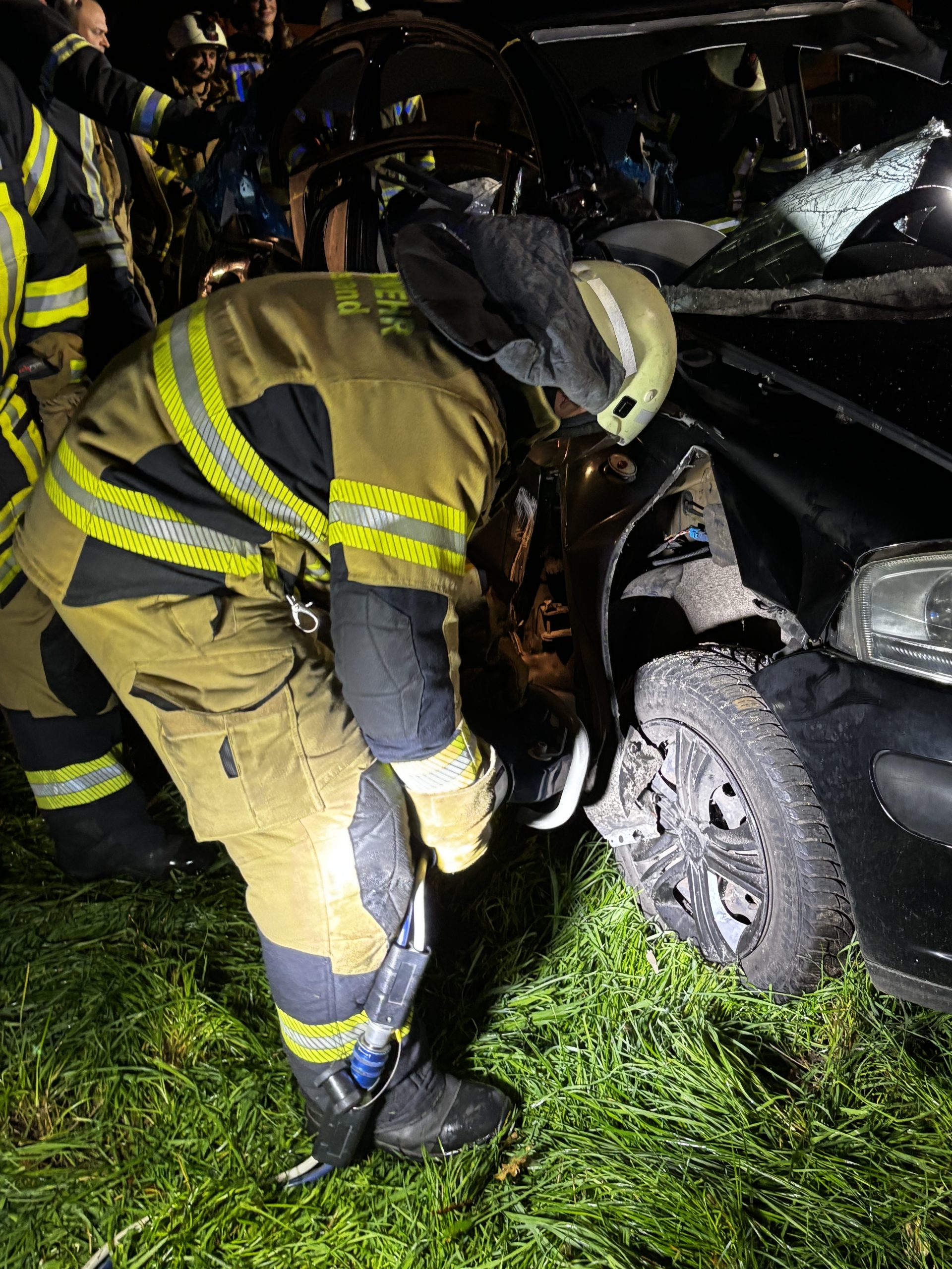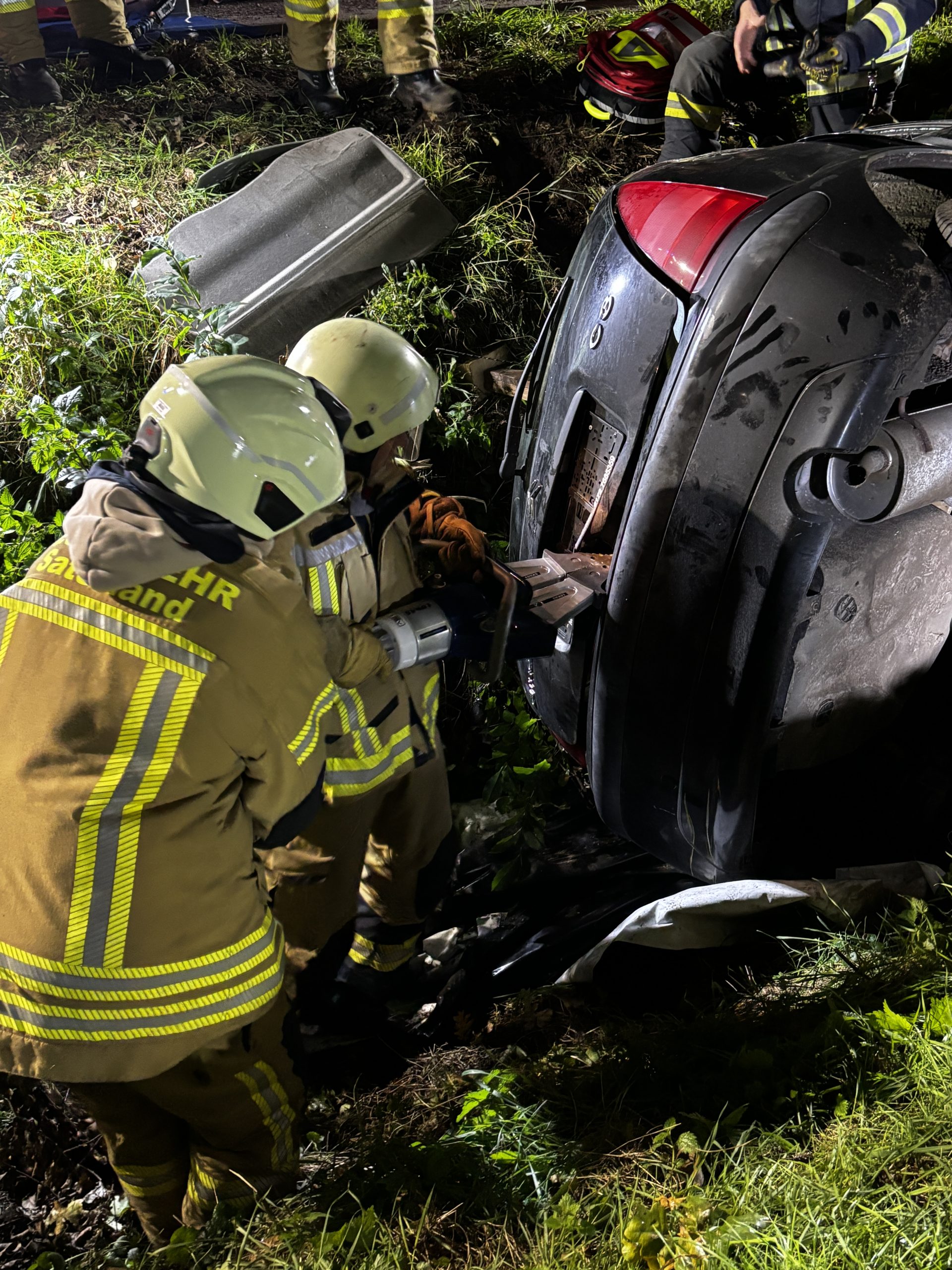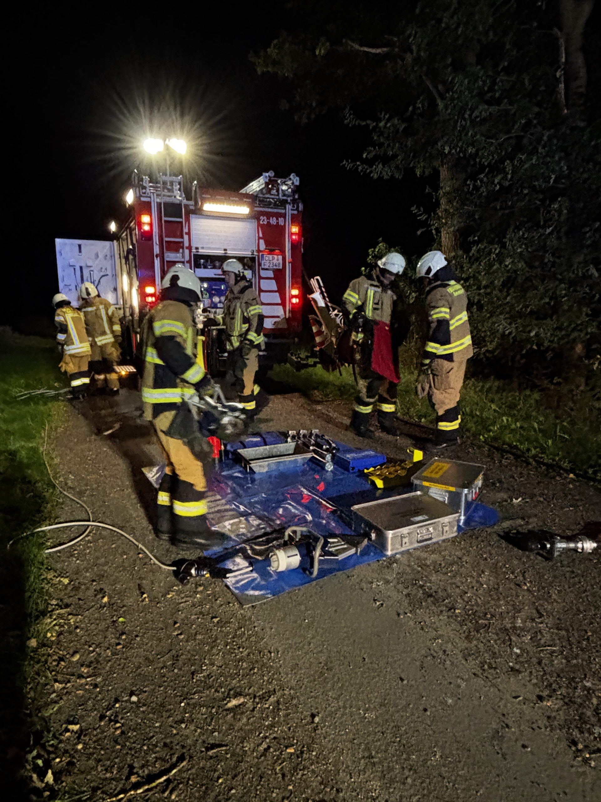 Um die Person patientengerecht befreien zu können, musste das Fahrzeug zunächst abgestützt und die Einsatzstelle großflächig ausgeleuchtet werden. Anschließend öffneten wir mit Schere und Spreizer den Kofferraumdeckel, um an die verunfallte Person zu gelangen.