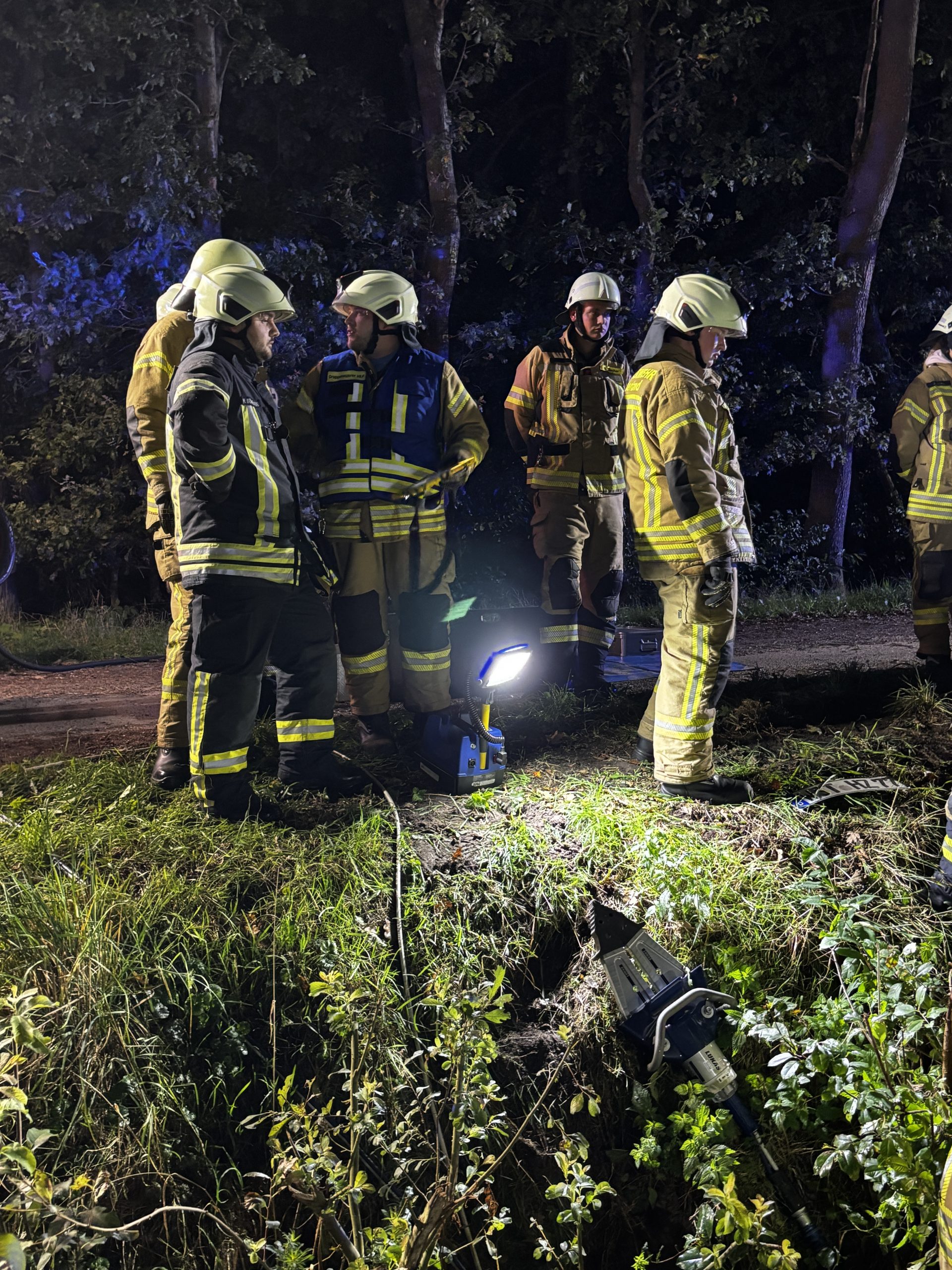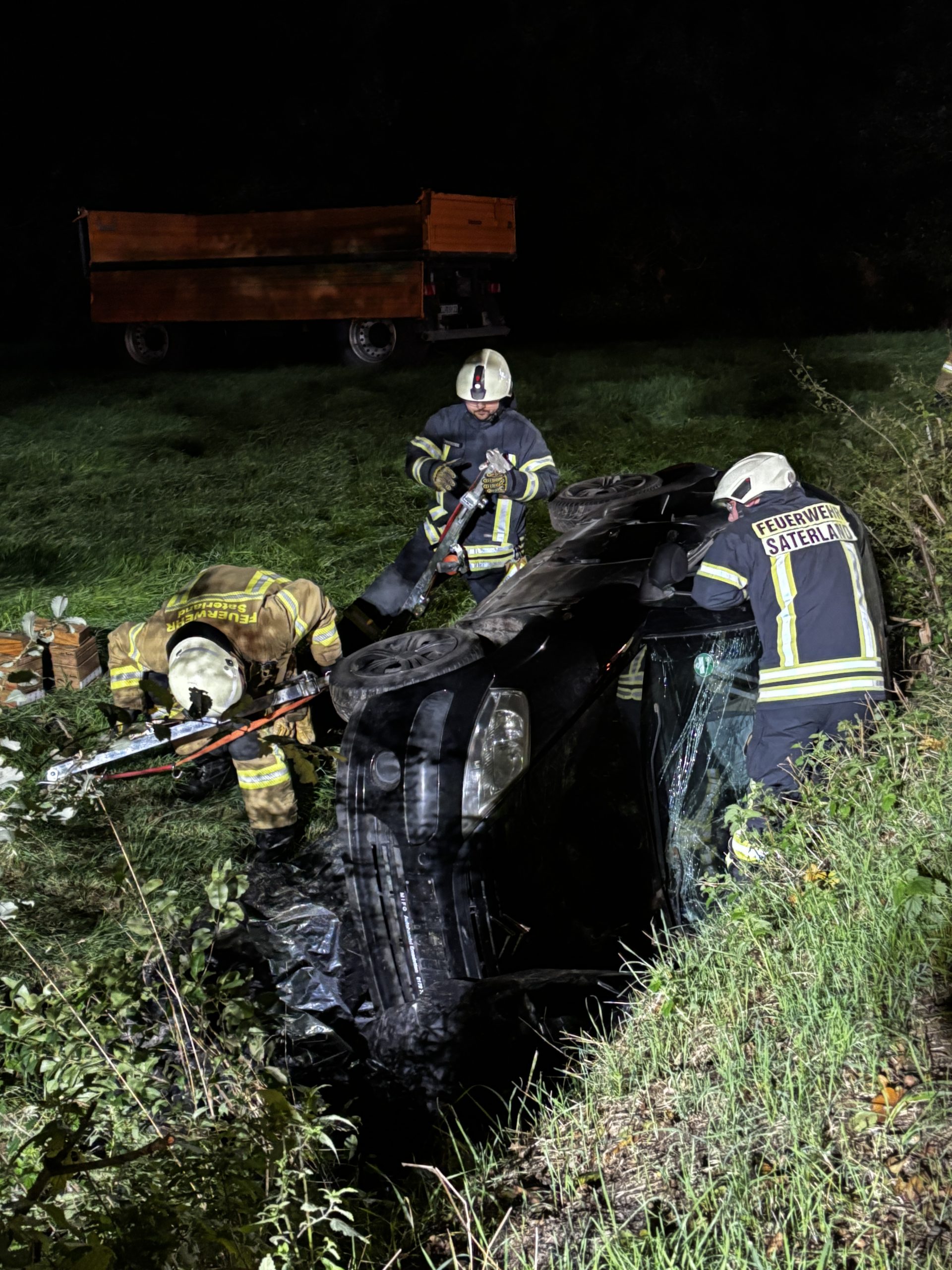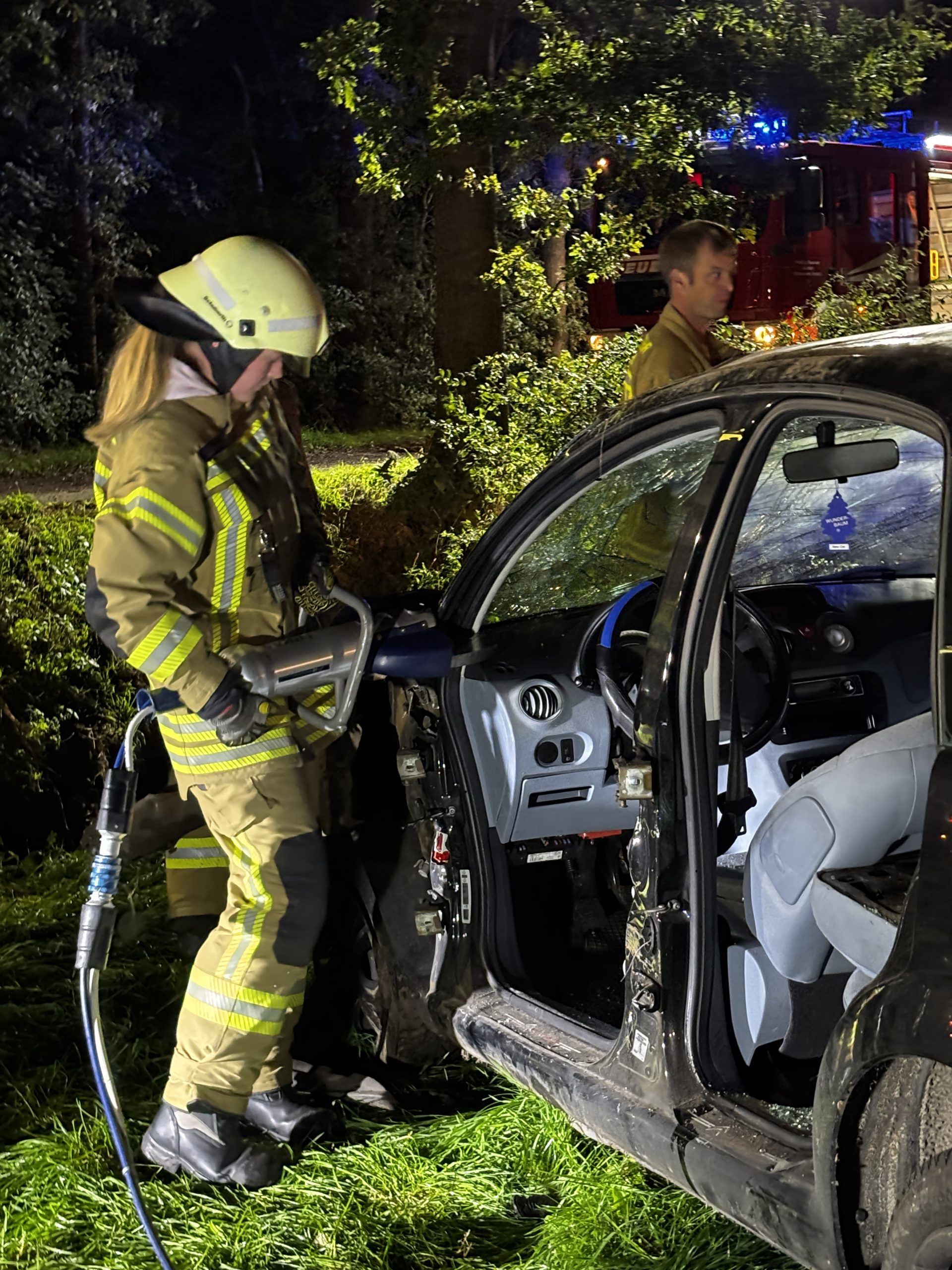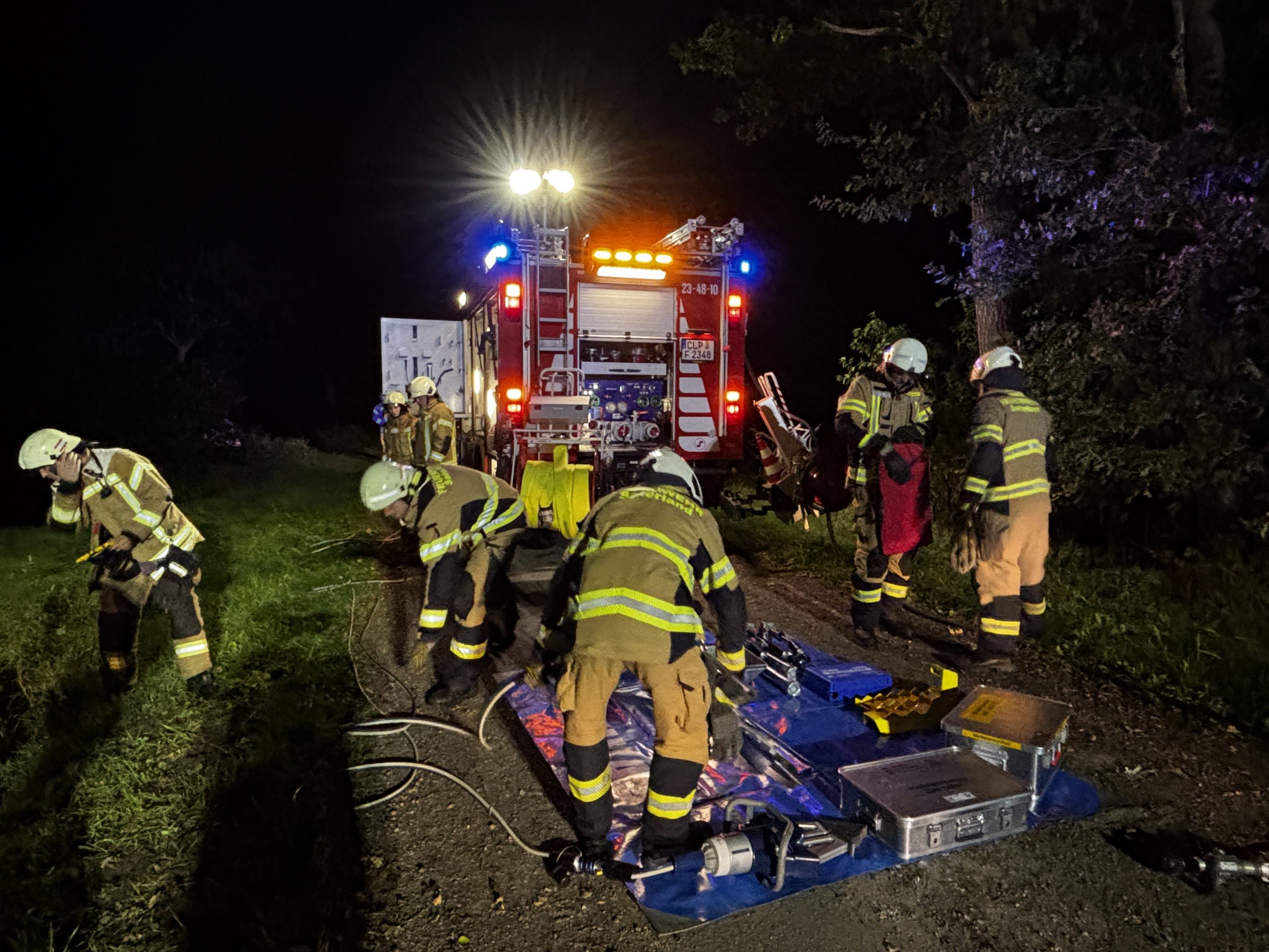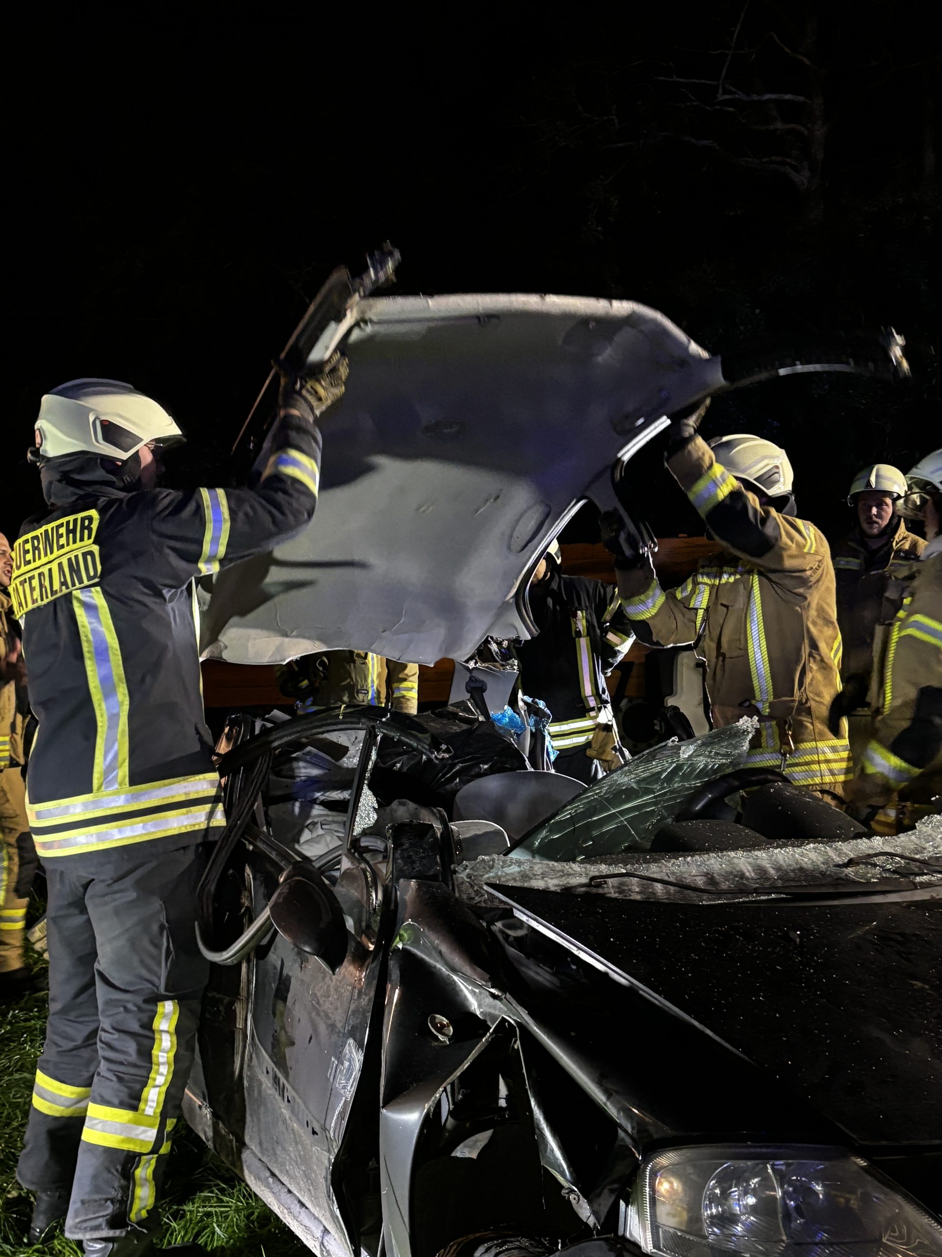 Um die Person patientengerecht befreien zu können, musste das Fahrzeug zunächst abgestützt und die Einsatzstelle großflächig ausgeleuchtet werden. Anschließend öffneten wir mit Schere und Spreizer den Kofferraumdeckel, um an die verunfallte Person zu gelangen.