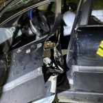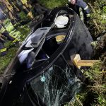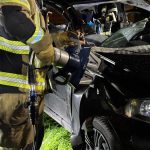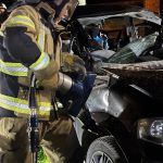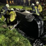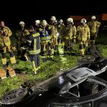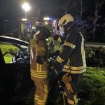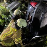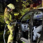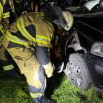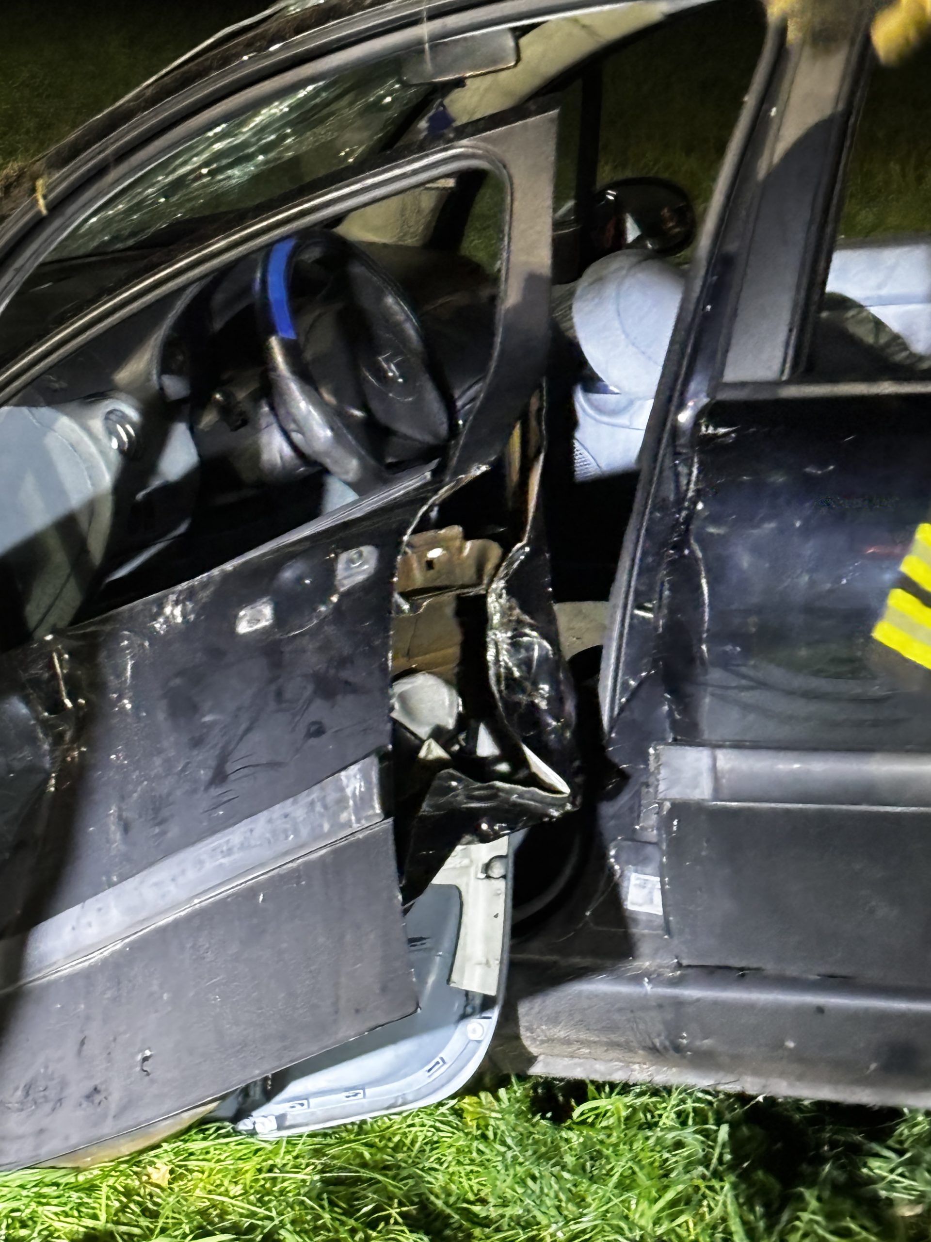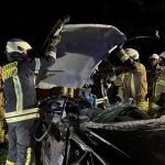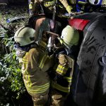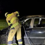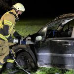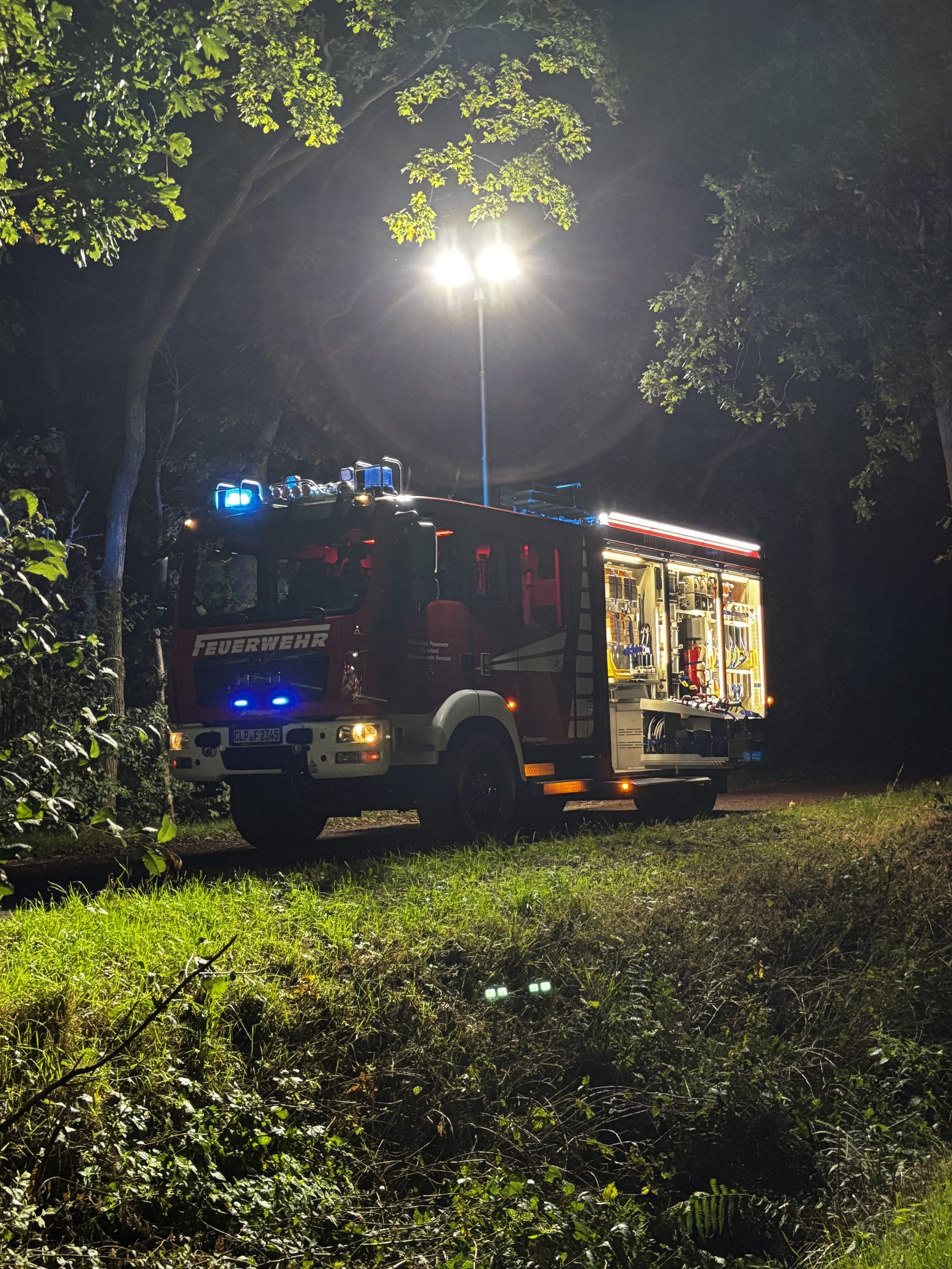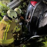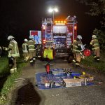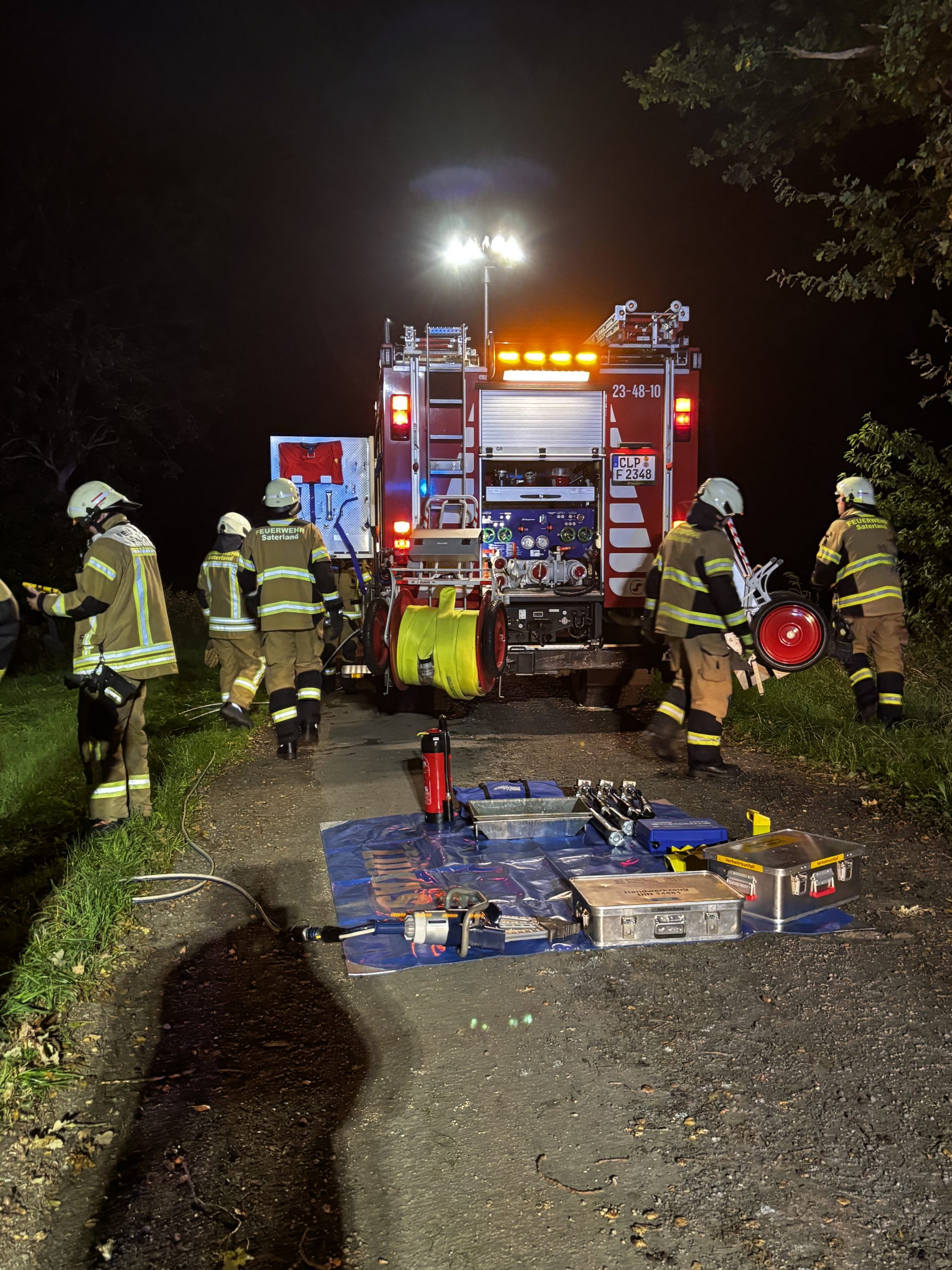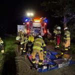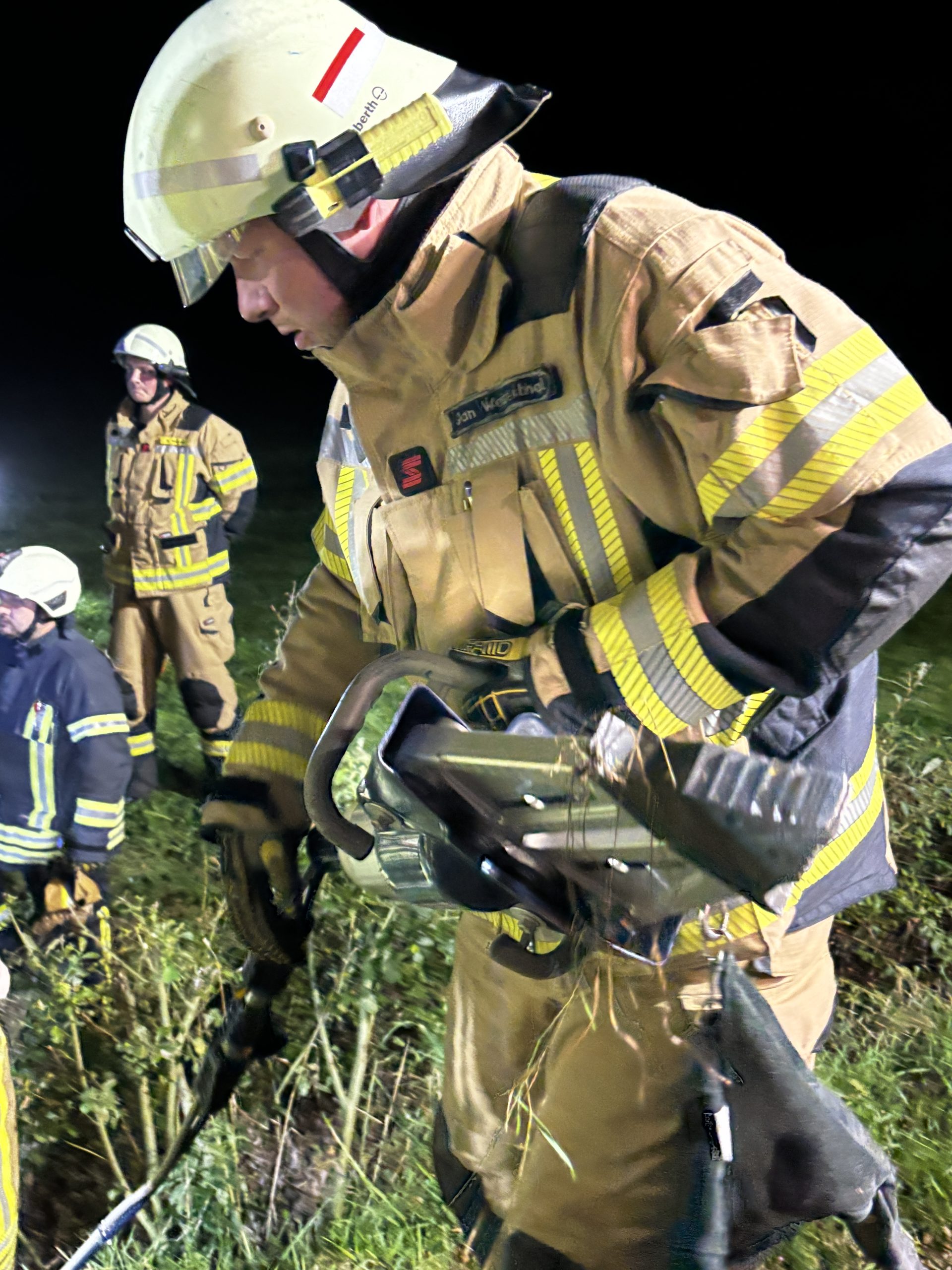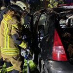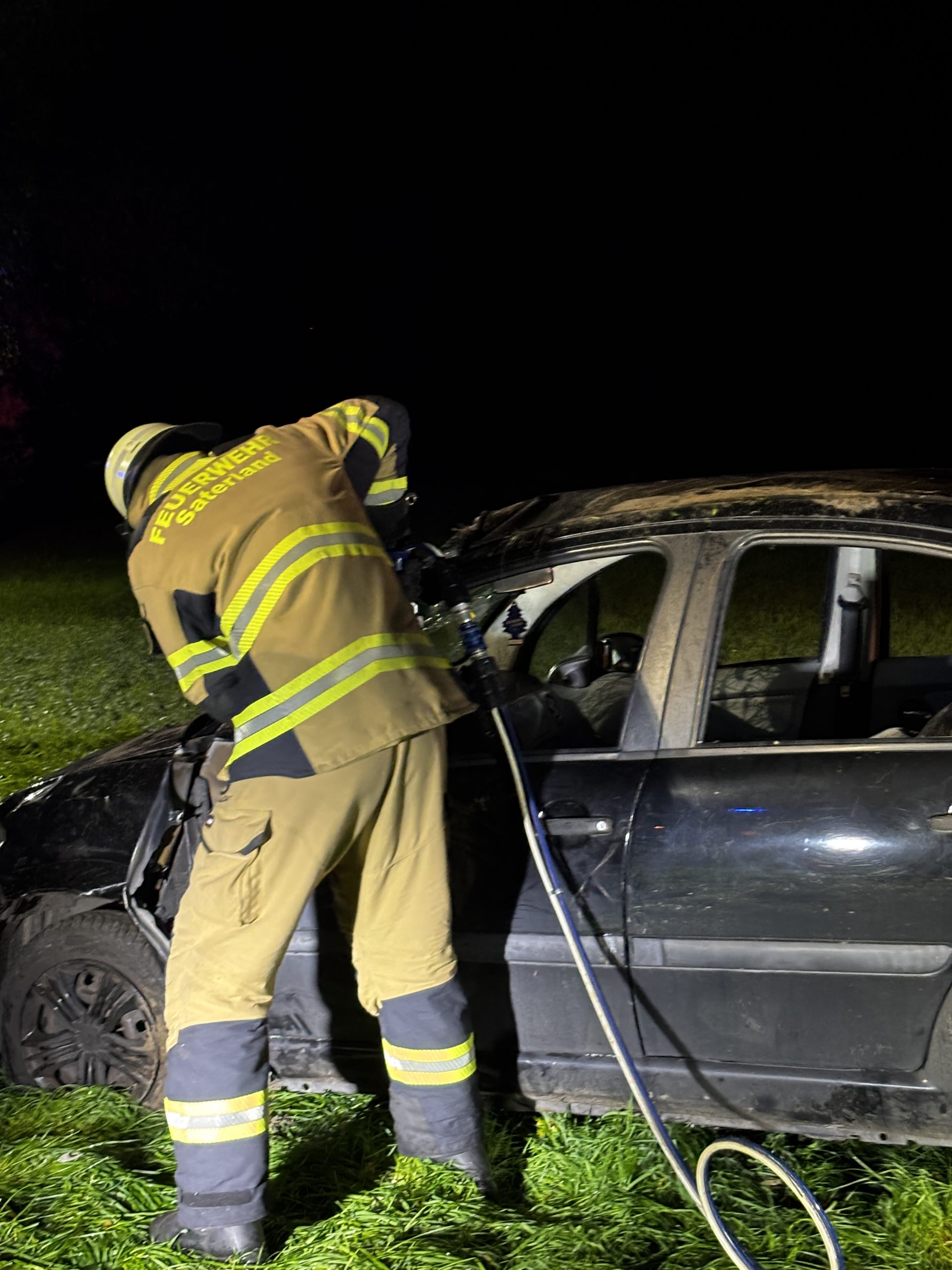 Um die Person patientengerecht befreien zu können, musste das Fahrzeug zunächst abgestützt und die Einsatzstelle großflächig ausgeleuchtet werden. Anschließend öffneten wir mit Schere und Spreizer den Kofferraumdeckel, um an die verunfallte Person zu gelangen.