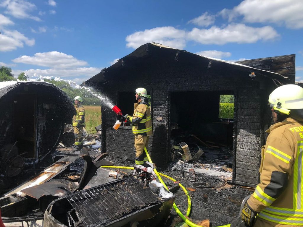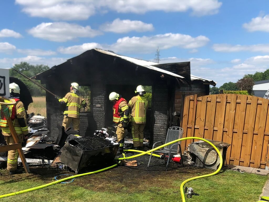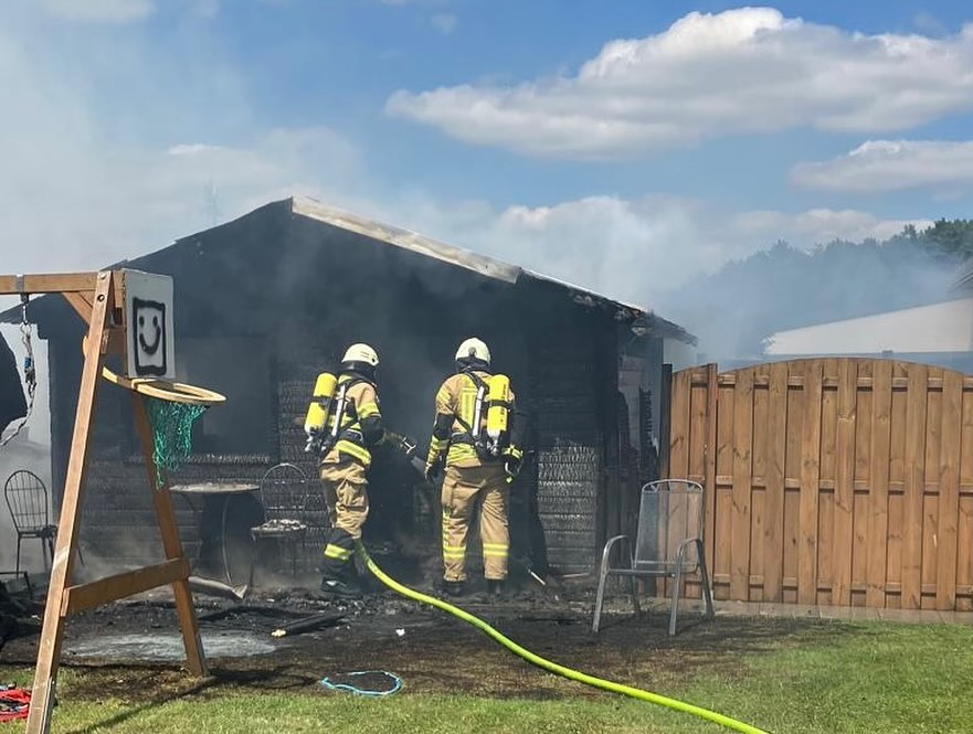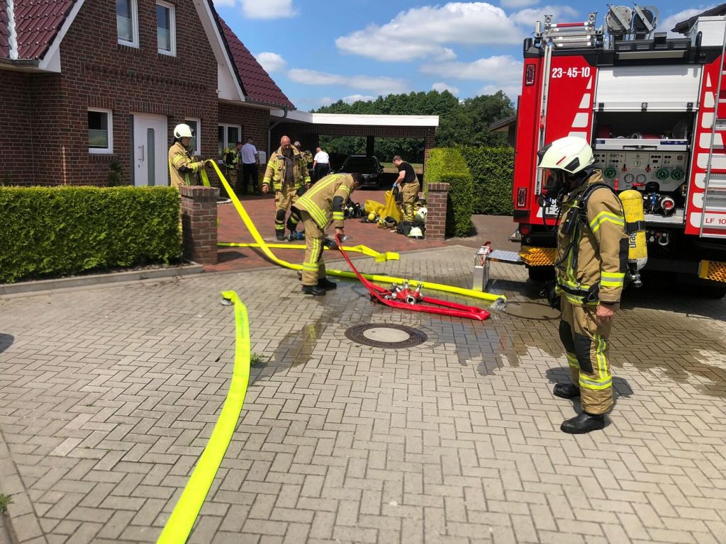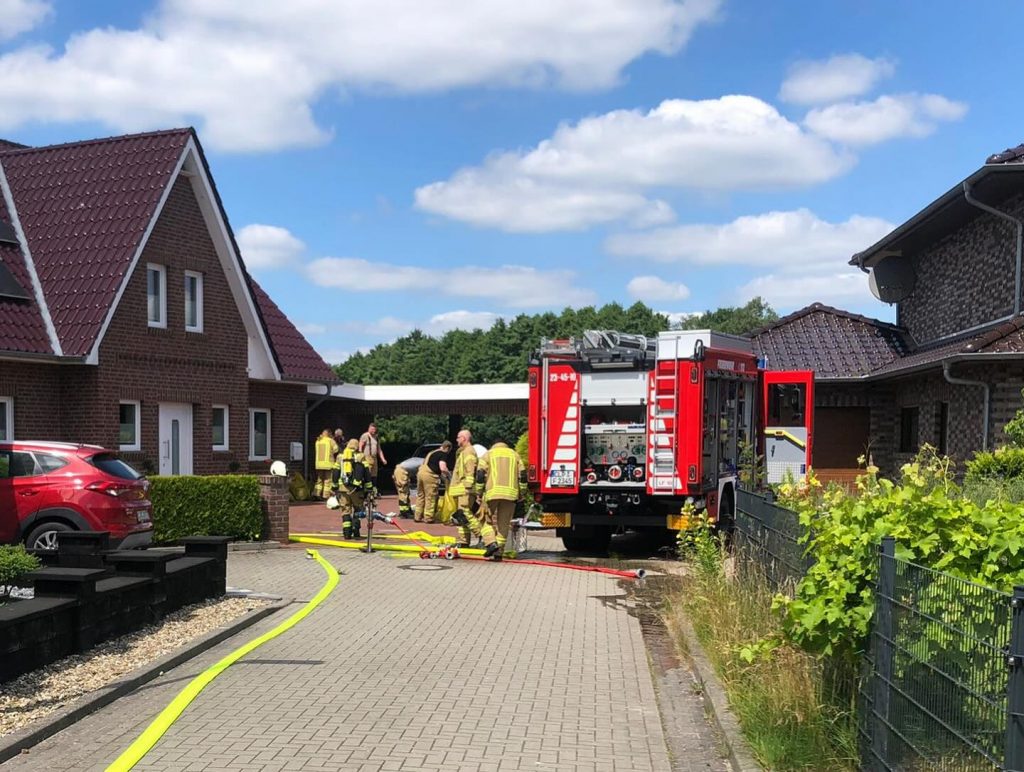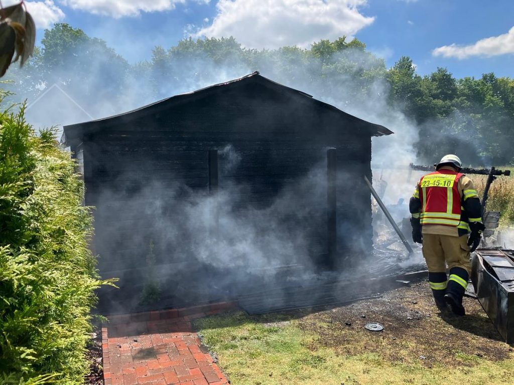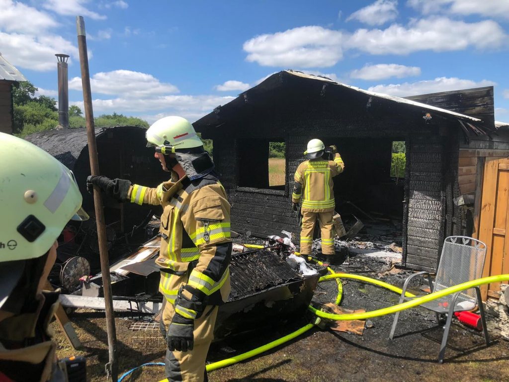 Ramsloh (LK Cloppenburg) – Am Montag, den 24.06.2024 wurden wir gegen 13:44 Uhr durch die Großleitstelle Oldenburger Land zu einem Einsatzstichwort F2 – brennt Bungalow alarmiert. Uns erwartete aber bei Eintreffen eine ca. 5x4m große Holzhütte die in Vollbrand stand. Mit ca. 35 Kameraden und Kameradinnen konnte ein Übergreifen auf anliegende Häuser verhindert werden.