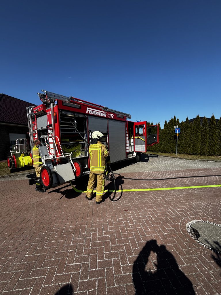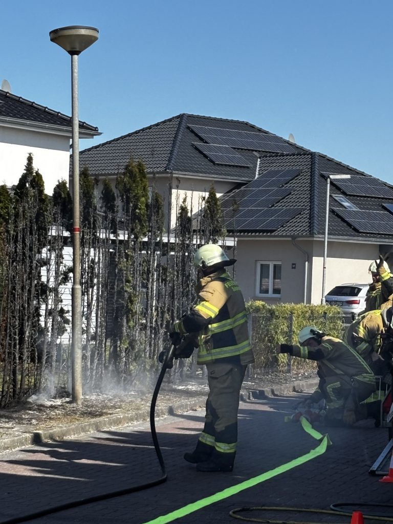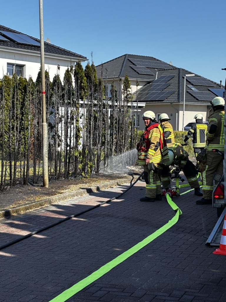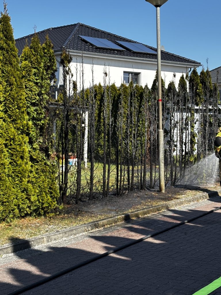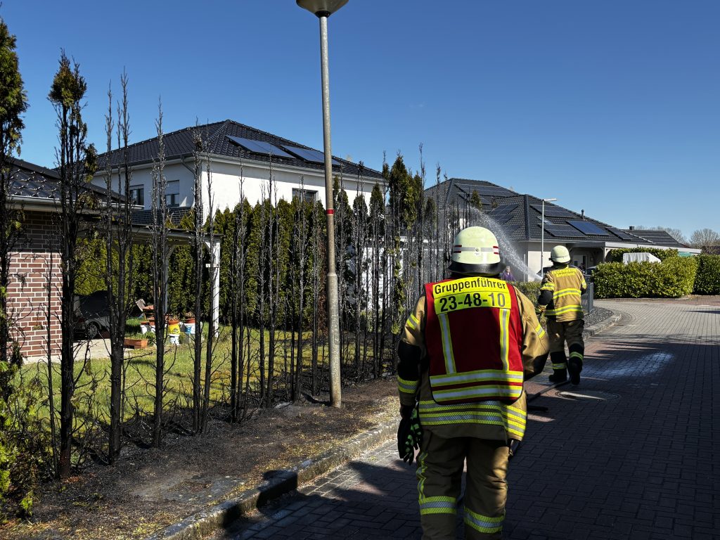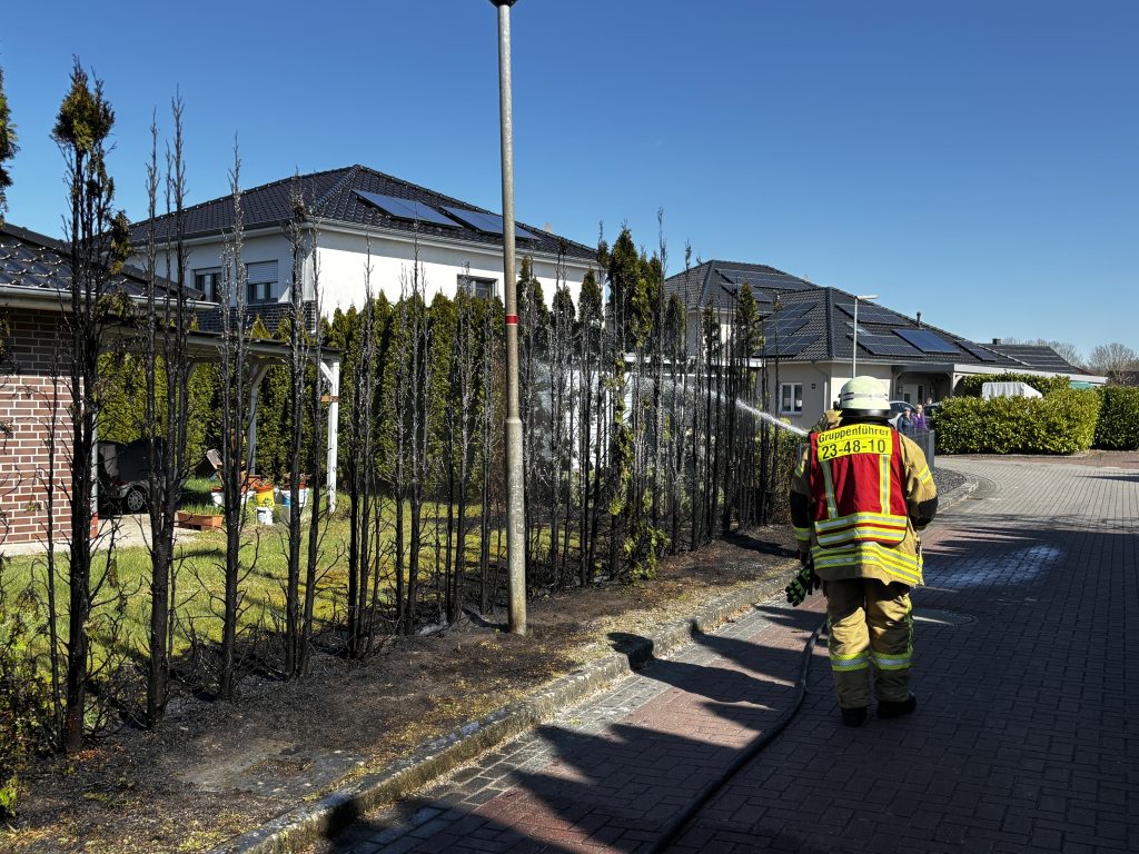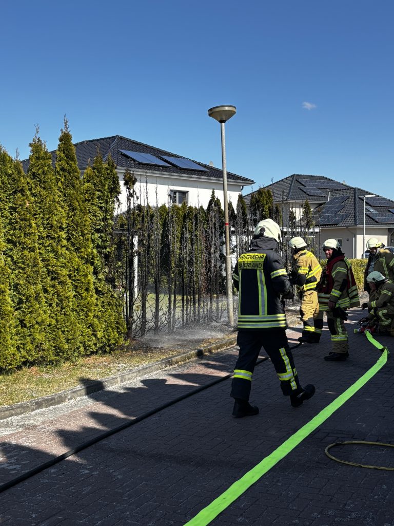 Zu einer 20m brennenden Thujahecke sind wir heute gegen 14:17 Uhr zur Straße ,,Am Ried’‘ in Ramsloh gerufen worden. Ein Gärtner in unmittelbarer Nähe hatte sofort geistesgegenwärtig mit einem Schlauch versucht die Hecke zu löschen. Beim eintreffen verlegten wir vom HLF einen Schnellangriff und brauchten somit nur noch die Nachlöscharbeiten durchführen.