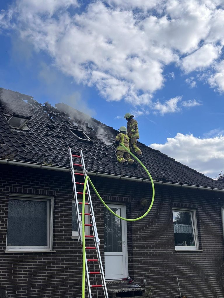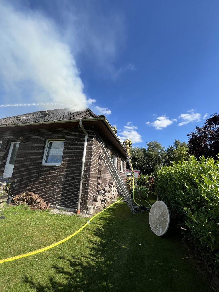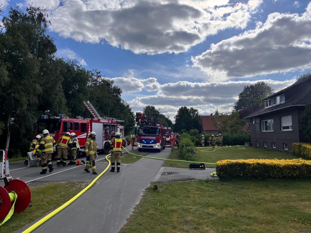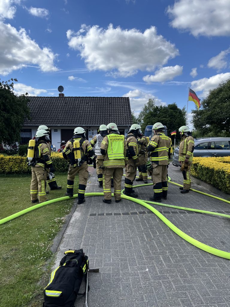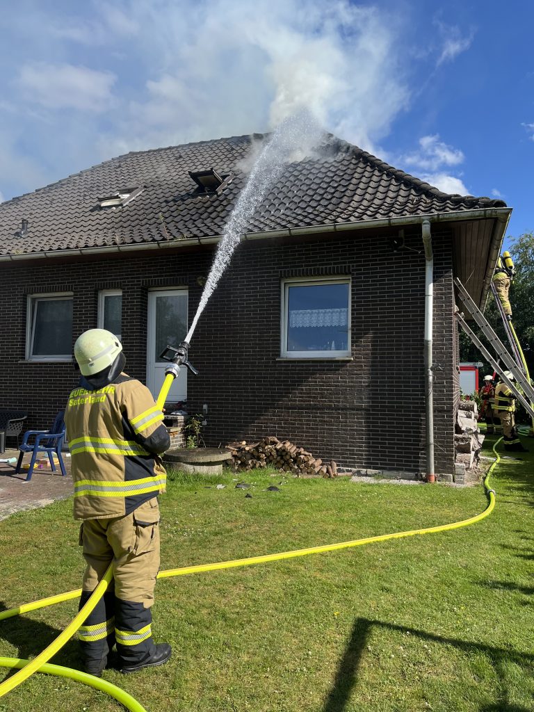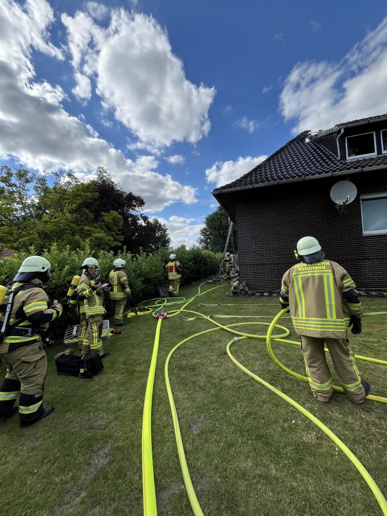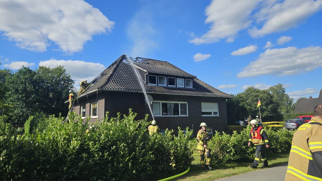 Ramsloh (LK Cloppenburg) – Am Freitag, den 28.06.24 gegen 17:16 Uhr wurde die Feuerwehr Ramsloh zur Elisabethfehner Straße gerufen. Auf Anfahrt hatte die Großleitstelle Oldenburger Land vom Schlafzimmerbrand auf Dachstuhlbrand erhöht, somit wurde die Feuerwehr aus Scharrel sowie die Drehleiter der FF Friesoythe nachalarmiert. Beim Eintreffen der Einsatzkräfte aus Ramsloh und sah man schon Rauch aus dem Dach steigen. Sofort machten sich vier Trupps unter Atemschutz bereit und begangen im Innenangriff das Feuer zu löschen (zwei direkt sowie zwei für die Nachlöscharbeiten). Ein Bewohner wurde bei Löschversuchen durch Brandrauch verletzt und wurde mit dem RTW ins Krankenhaus gebracht. Auch das PSNV Team war mit zwei Einsatzkräften zur Betreuung vor Ort. Das Gebäude ist vorerst nicht mehr bewohnbar.