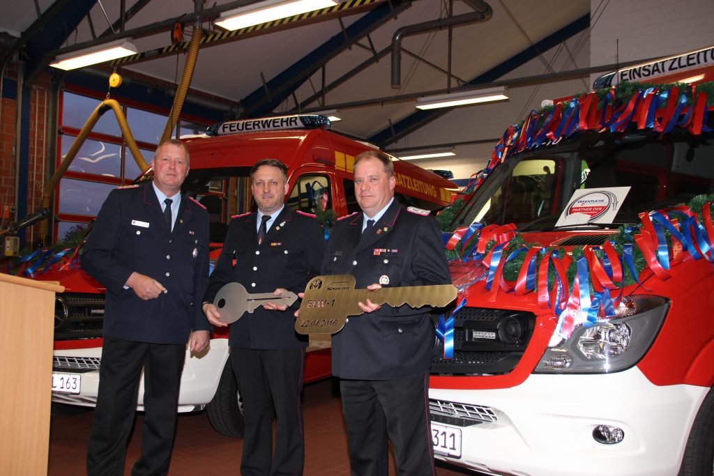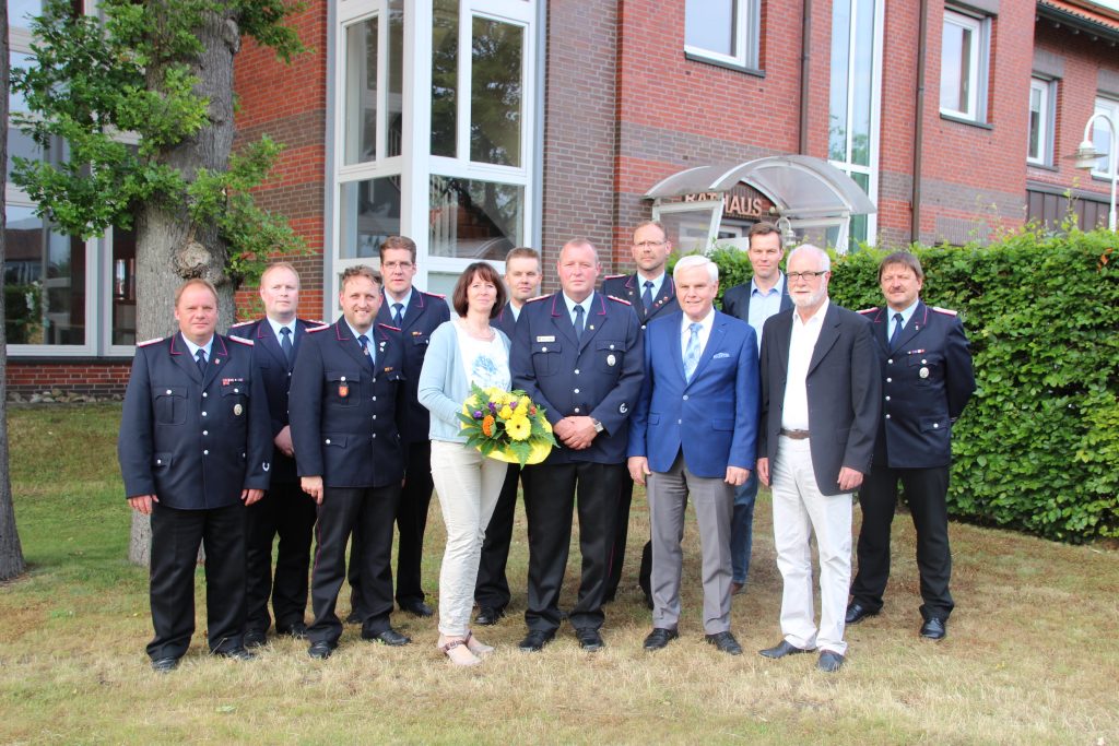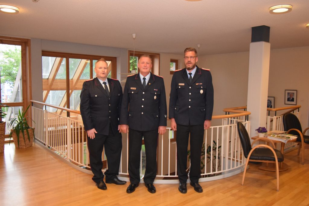 Ernennung des neuen Gemeindebrandmeisters Hartmut Hanekamp (Bild rechts) und seinem Stellvertreter Kevin Heese (Bild links) sowie Verabschiedung des alten Gemeindebrandmeisters Rolf Tebben (Bild mitte)