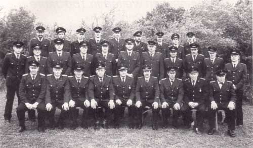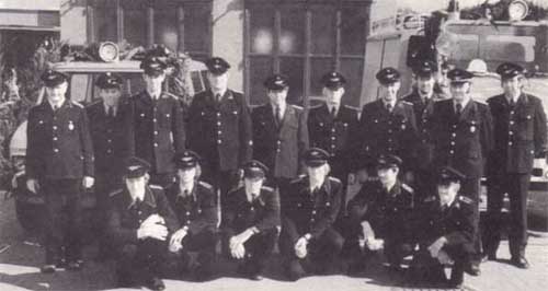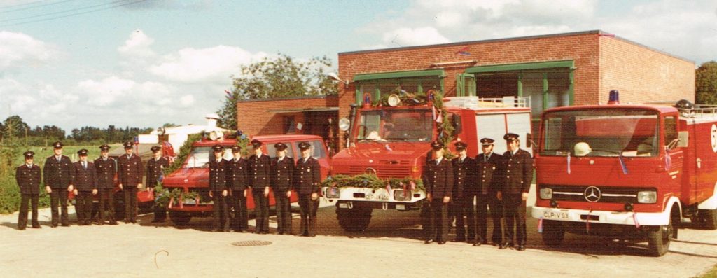 Dieses Bild zeigt die Feuerwehr 1979 anlässlich der Übergabe des TLF 8 W und des ELW. Stehend von links: Hans Blömer, Heinrich Meyer, Bernhard Kruse, Johann Nagel, Bernhard Geesen, Heinrich Oltmanns, Gerhard Heese, Dieter Brinkmann, Ortsbrandmeister Johannes Tebben, stv. Ortsbrandmeister Hans-Hermann Deddens. Untere Reihe kniend: Gerhard Henken, Franz Dannebaum jun., Gerhard Tebben, Ewald Meyer, Johann Schulte, Georg Schulte