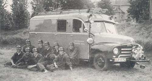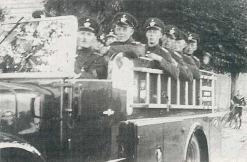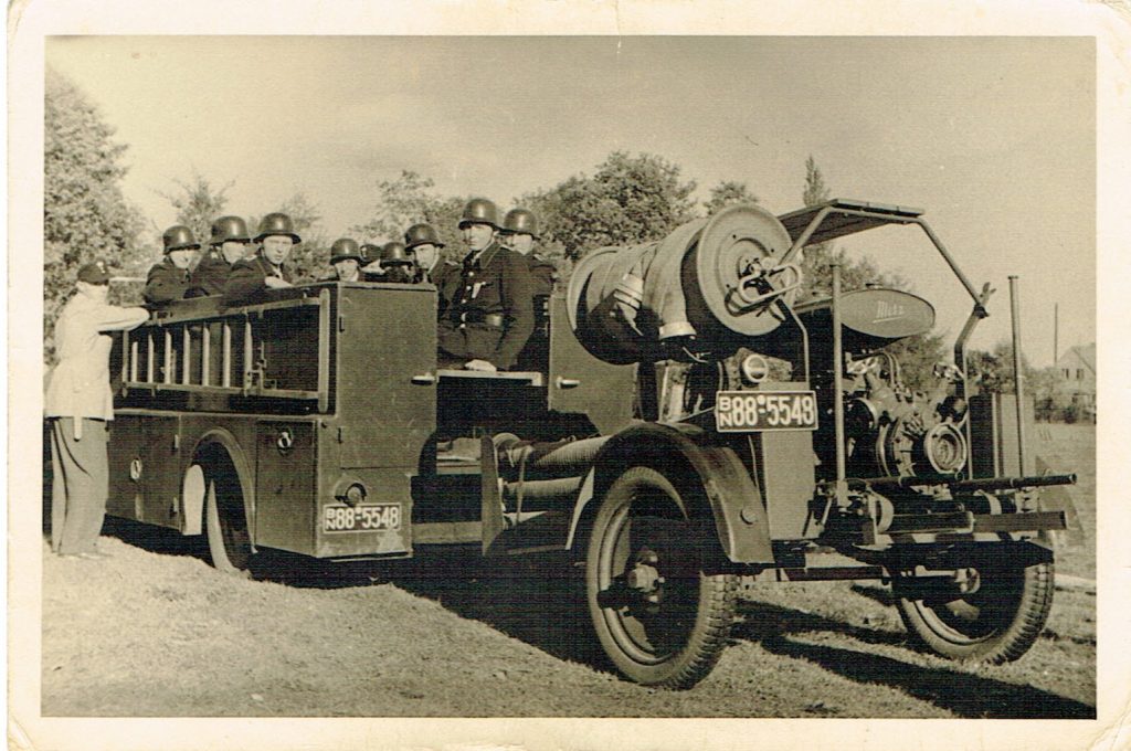 Dieses Bild zeigt den Mannschaftswagen der Freiwilligen Feuerwehr Ramsloh aus dem Jahre 1945. Es zeigt die Feuerwehrkameraden Andreas van Westen, Heinrich Heese, Hermann Fugel, Anton Kösters, Willi Wilkens, Fritz Janßen