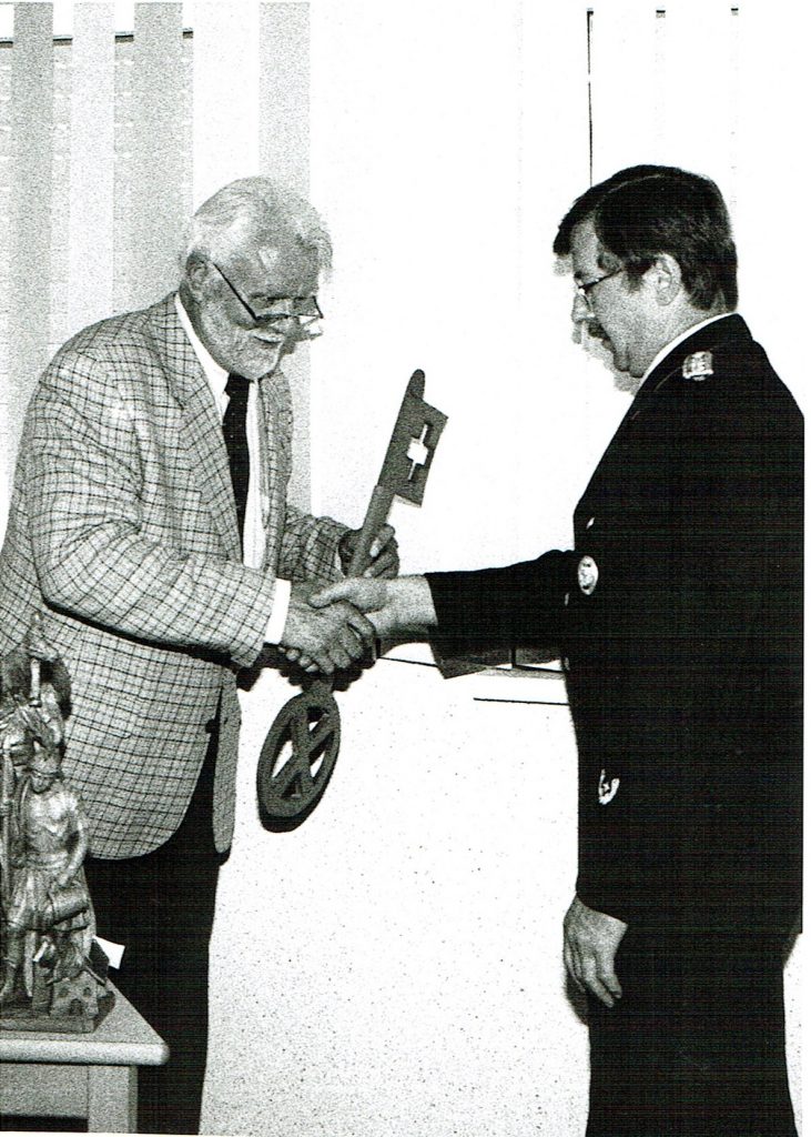 Einweihung des neuen Feuerwehrhauses an der Hauptstraße: Das Bild zeigt die Schlüsselübergabe an Johann Schulte