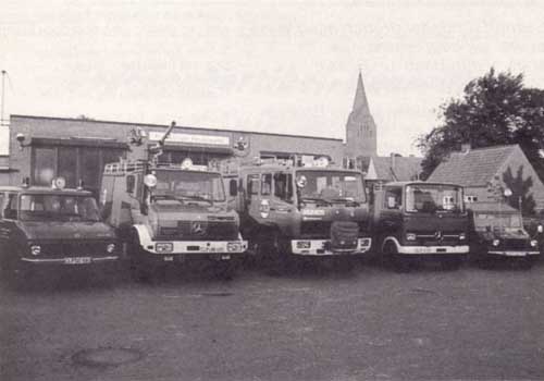 Dieses Bild zeigt das 1973 erbaute Feuerwehrhaus und den 1985 errichteten Anbau. Die Fahrzeuge der Freiwilligen Feuerwehr Ramsloh 1990, von links: ELW1, TLF 8 W, LF 8 S, TLF 8 S und Moorbrandfahrzeug (Jeep)