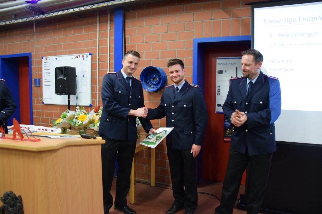 Bürgermeister Thomas Otto beförderte den stellvertretenden Ortsbrandmeister Timo Hinrichs zum Hauptlöschmeister und den Ortsbrandmeister Matthias Schulte zum Oberbrandmeister.