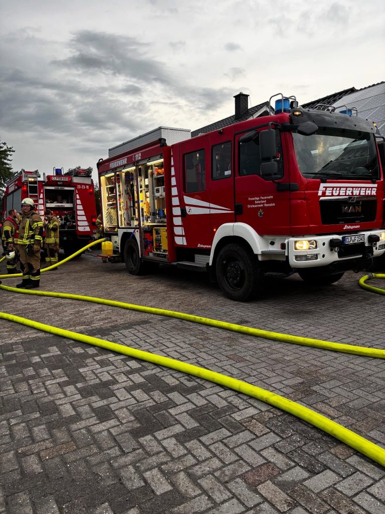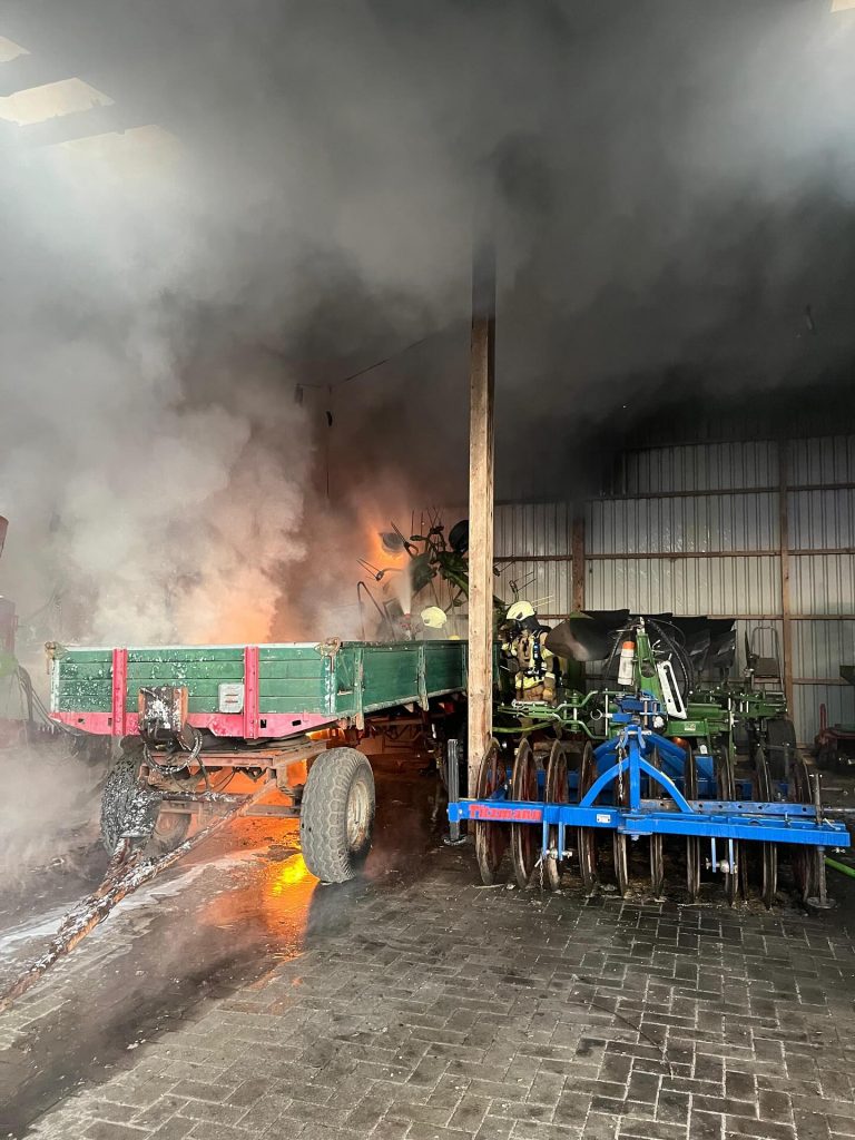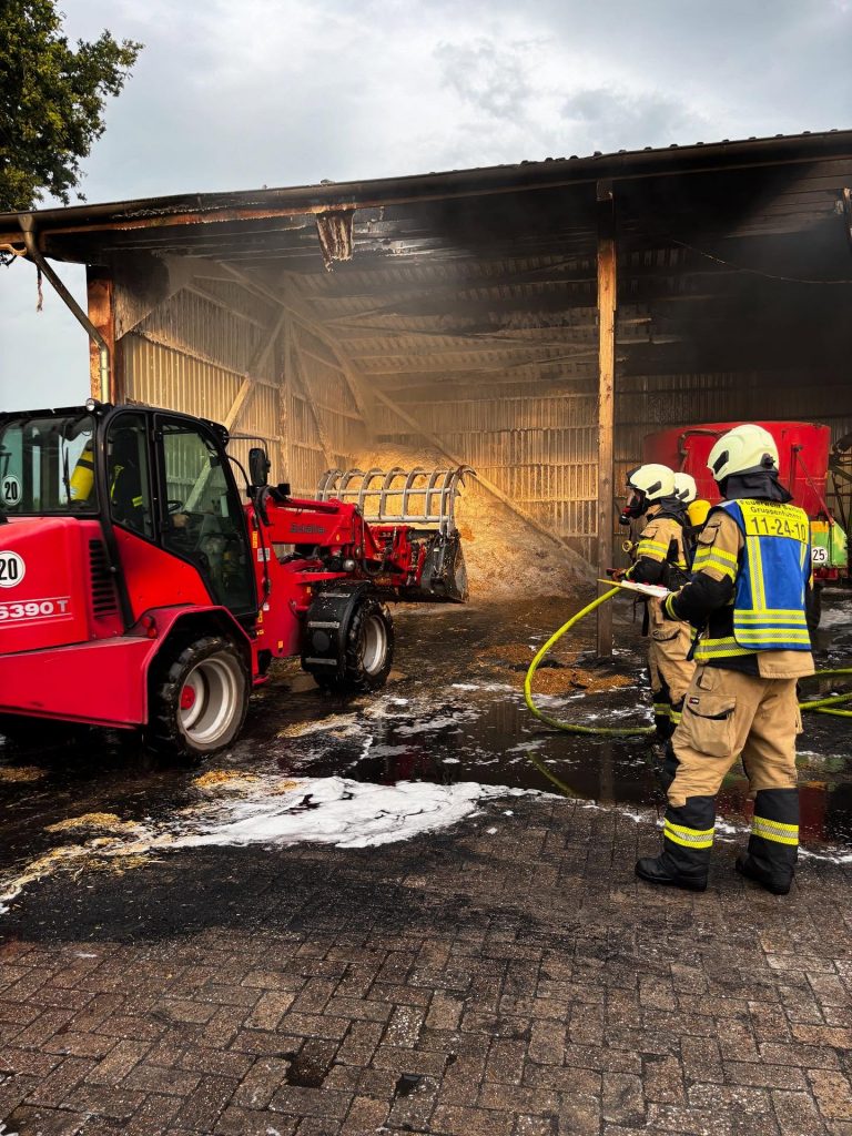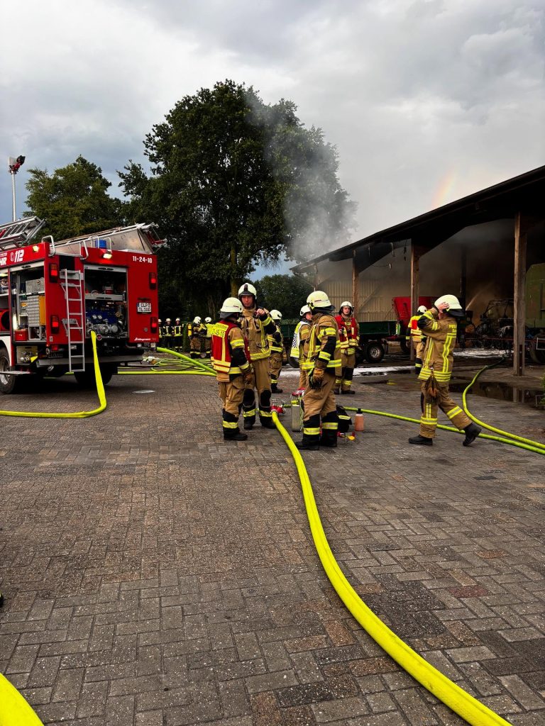 Am Mittwochabend, den 2. Juli 2025, wurde die Feuerwehr Ramsloh um 20:24 Uhr zu einem zweiten Einsatz des Tages alarmiert. In Elisabethfehn in der Schleusenstraße war eine Maschinenhalle auf einem landwirtschaftlichen Betrieb in Brand geraten. Hier wurden wir zur Unterstützung für die FF Barßel gerufen worden. Vor Ort stand ein älterer Traktor in Flammen, mit ihm mehrere Maschinen sowie eingelagertes Stroh. Gemeinsam mit den ebenfalls alarmierten Feuerwehren aus Barßel und Godensholt rückten wir zügig zur Einsatzstelle aus. Beim Eintreffen der Einsatzkräfte wurde sofort mit einem gezielten Löschangriff vorgegangen. Unter Atemschutz bekämpften die Einsatzkräfte das Feuer. Das brennende Stroh wurde mithilfe eines Radladers aus der Halle transportiert und auf einem improvisierten Ablöschplatz von der Feuerwehr Godensholt abgelöscht.