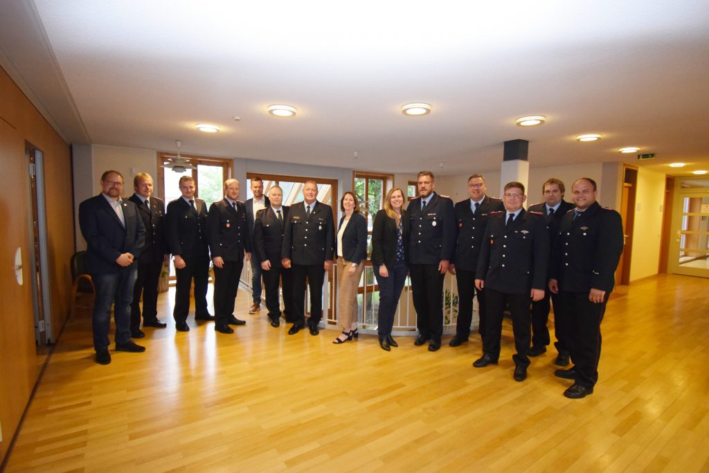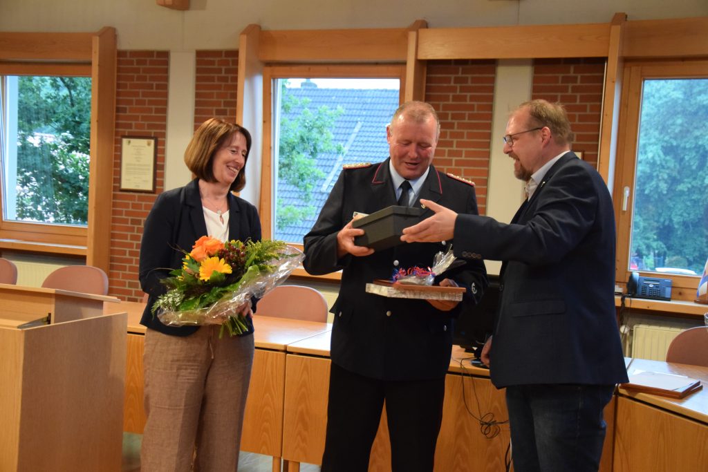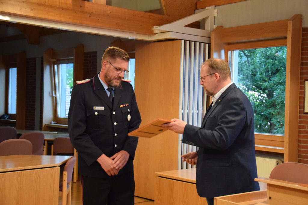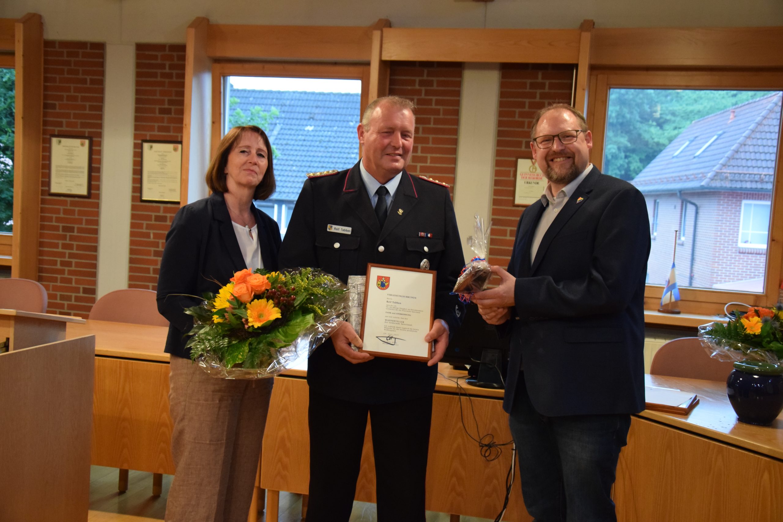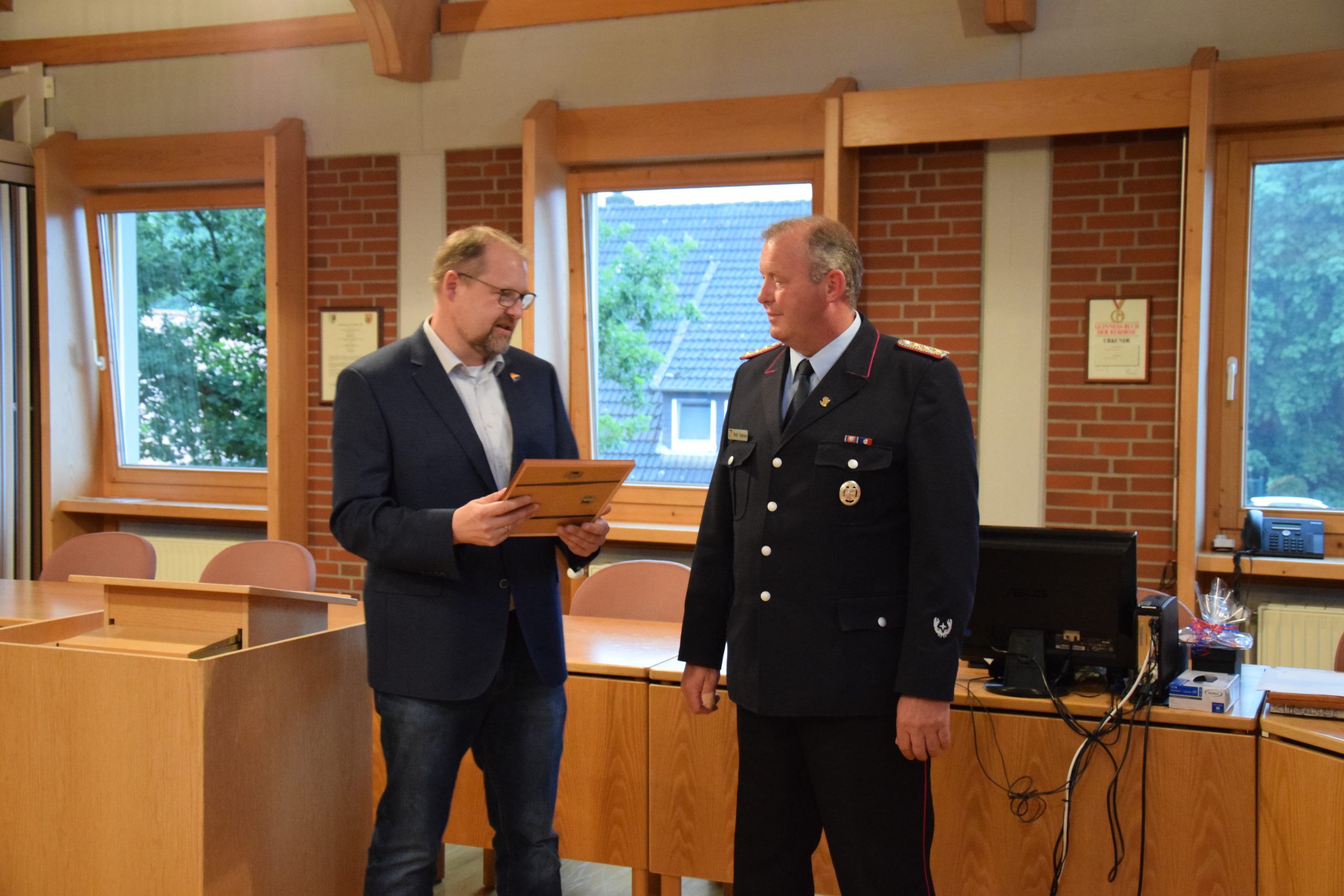 Saterland – Ramsloh / LK CLP – Am Dienstag, den 29.06.2021 trafen sich Bürgermeister Thomas Otto, Fachbereichsleiter Christof Naber, Gemeindepressewart Thomas Giehl, sowie das Gemeindekommando der Feuerwehr Saterland im großen Sitzungssaal des Rathauses in Ramsloh, um den amtierenden Gemeindebrandmeister Rolf Tebben offiziell zu verabschieden und gleichzeitig den neuen Gemeindebrandmeister Hartmut Hanekamp von der Feuerwehr Scharrel und seinen Stellvertreter Kevin Heese von der Feuerwehr Ramsloh die Ernennungsurkunden zu überreichen. Rolf Tebben der 12 Jahre als Ehrenamtlicher Gemeindebrandmeister tätig war, beendet seine Amtszeit am 30.06.2021. In einer kleinen Ansprache lobte Bürgermeister Thomas Otto noch einmal das Engagement von Rolf Tebben. Du warst 28 Jahre im Ehrenamtsverhältnis, dass ist heutzutage nicht selbstverständlich, dafür möchte ich mich recht herzlich bedanken, so Bürgermeister Thomas Otto. Er überreichte Rolf Tebben eine Verleihungsurkunde und ein Wappenteller der Gemeinde Saterland. Weiter ging es mit der Übergabe der Ernennungsurkunden für den neuen Gemeindebrandmeister Hartmut Hanekamp und seinen Stellvertreter Kevin Heese. Auch GBM Rolf Tebben bedankte sich bei der Verwaltung und dem Rat der Gemeinde Saterland, seinen Stellvertreter Hartmut Hanekamp und dem Gemeindekommando für das Vertrauen was ihm durch alle Kameraden der Feuerwehren aus Ramsloh und Scharrel in den 12 Jahren als Gemeindebrandmeister ausgesprochen wurde. Ein großer Dank ging natürlich an seine Ehefrau Anke, die in den ganzen Jahren auf einiges verzichten musste und ihm immer den Rücken freigehalten hat, wenn er im Namen der Feuerwehr unterwegs war. Gemeindebrandmeister Hartmut Hanekamp ließ es sich nicht nehmen und hielt eine kleine Laudatio über den scheidenden Gemeindebrandmeister Rolf Tebben. Zum Schluss gratulierten alle Kameraden dem neuen Führungsteam der Feuerwehr Saterland.