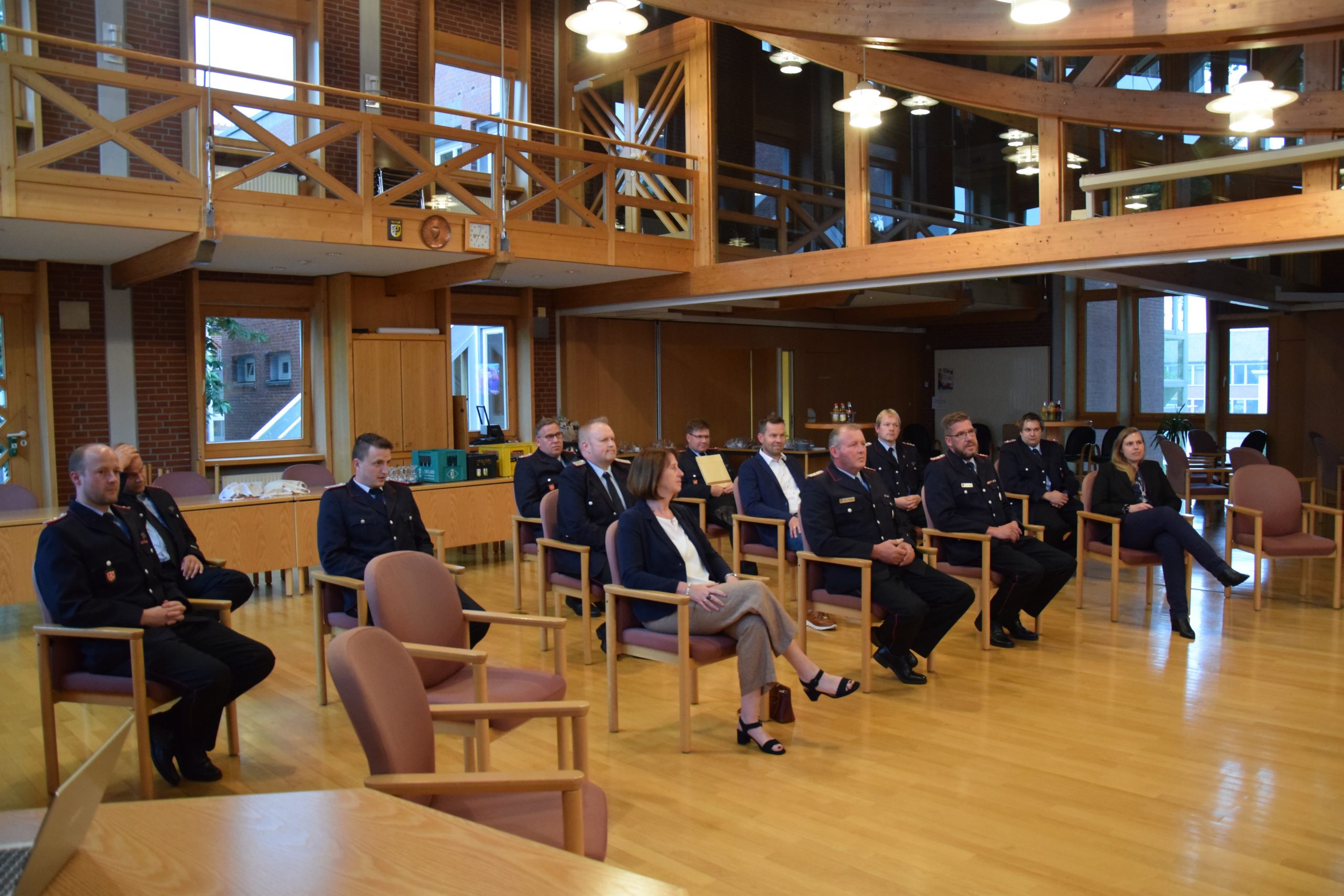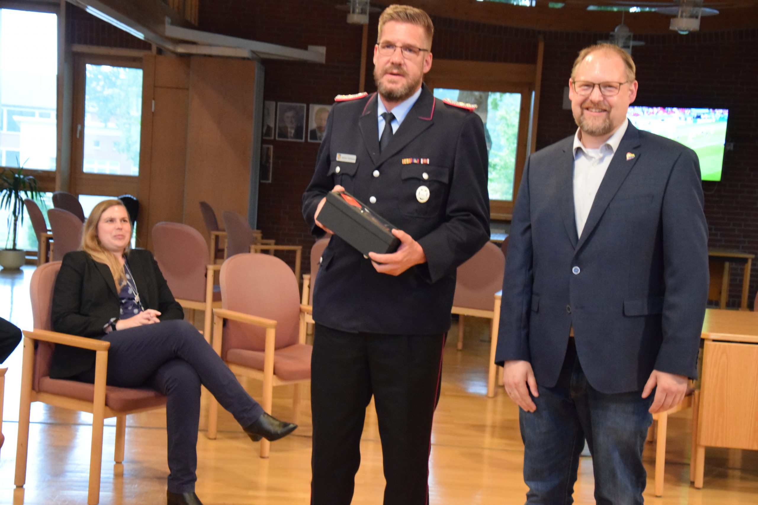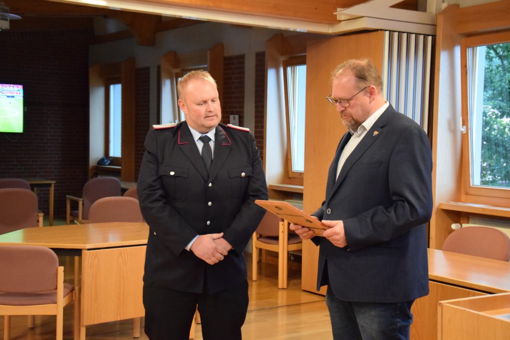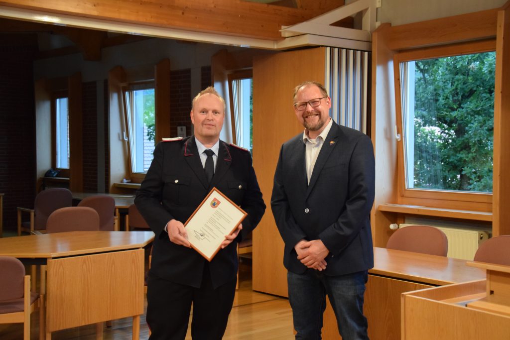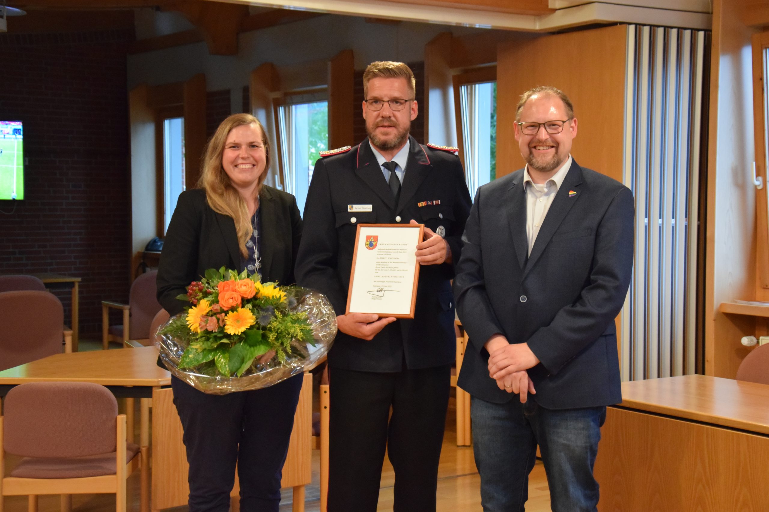Saterland – Ramsloh / LK CLP – Am Dienstag, den 29.06.2021 trafen sich Bürgermeister Thomas Otto, Fachbereichsleiter Christof Naber, Gemeindepressewart Thomas Giehl, sowie das Gemeindekommando der Feuerwehr Saterland im großen Sitzungssaal des Rathauses in Ramsloh, um den amtierenden Gemeindebrandmeister Rolf Tebben offiziell zu verabschieden und gleichzeitig den neuen Gemeindebrandmeister Hartmut Hanekamp von der Feuerwehr Scharrel und seinen Stellvertreter Kevin Heese von der Feuerwehr Ramsloh die Ernennungsurkunden zu überreichen. Rolf Tebben der 12 Jahre als Ehrenamtlicher Gemeindebrandmeister tätig war, beendet seine Amtszeit am 30.06.2021. In einer kleinen Ansprache lobte Bürgermeister Thomas Otto noch einmal das Engagement von Rolf Tebben. Du warst 28 Jahre im Ehrenamtsverhältnis, dass ist heutzutage nicht selbstverständlich, dafür möchte ich mich recht herzlich bedanken, so Bürgermeister Thomas Otto. Er überreichte Rolf Tebben eine Verleihungsurkunde und ein Wappenteller der Gemeinde Saterland. Weiter ging es mit der Übergabe der Ernennungsurkunden für den neuen Gemeindebrandmeister Hartmut Hanekamp und seinen Stellvertreter Kevin Heese. Auch GBM Rolf Tebben bedankte sich bei der Verwaltung und dem Rat der Gemeinde Saterland, seinen Stellvertreter Hartmut Hanekamp und dem Gemeindekommando für das Vertrauen was ihm durch alle Kameraden der Feuerwehren aus Ramsloh und Scharrel in den 12 Jahren als Gemeindebrandmeister ausgesprochen wurde. Ein großer Dank ging natürlich an seine Ehefrau Anke, die in den ganzen Jahren auf einiges verzichten musste und ihm immer den Rücken freigehalten hat, wenn er im Namen der Feuerwehr unterwegs war. Gemeindebrandmeister Hartmut Hanekamp ließ es sich nicht nehmen und hielt eine kleine Laudatio über den scheidenden Gemeindebrandmeister Rolf Tebben. Zum Schluss gratulierten alle Kameraden dem neuen Führungsteam der Feuerwehr Saterland.