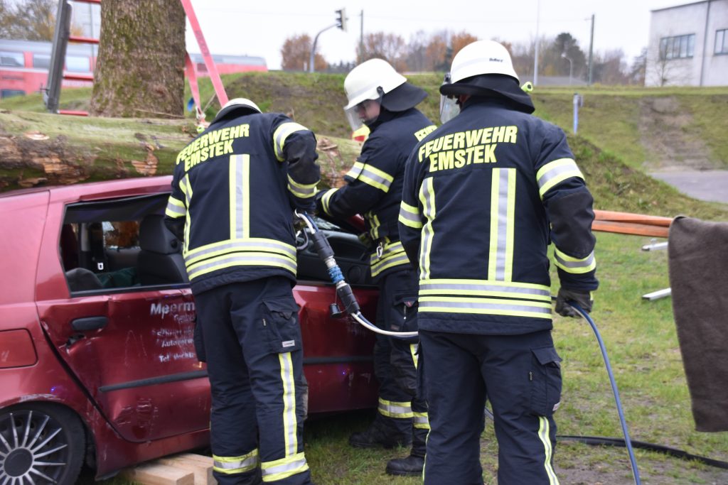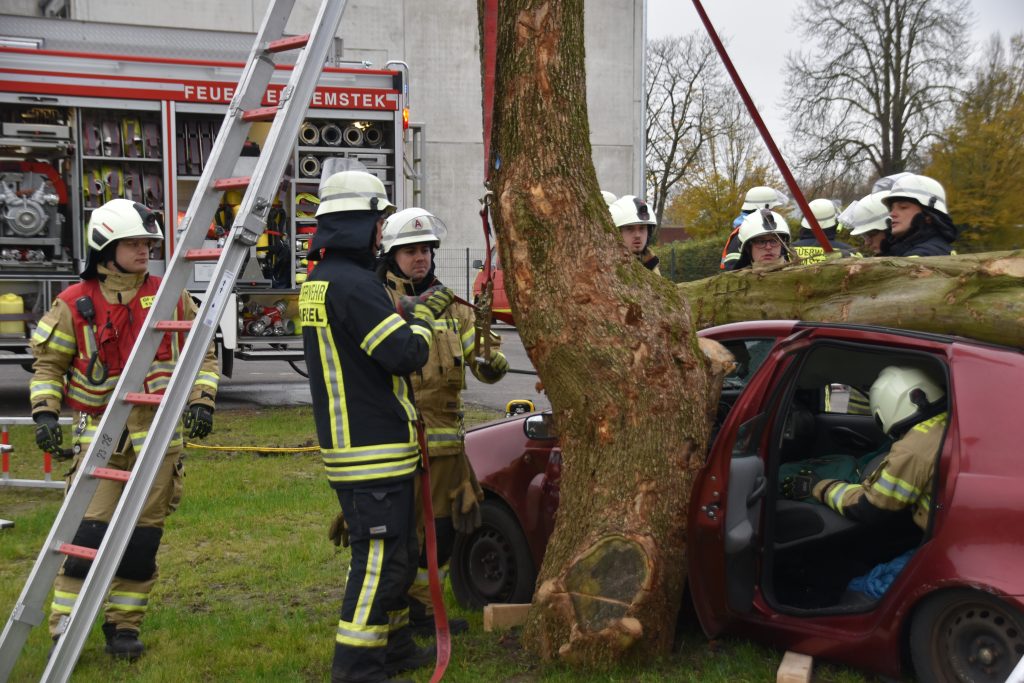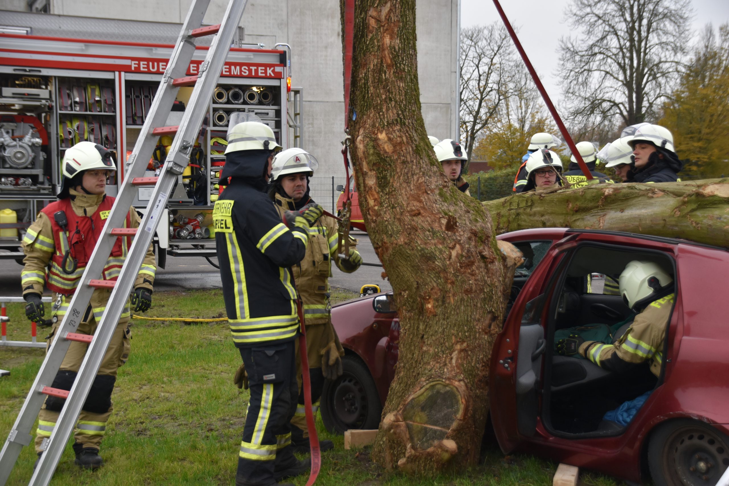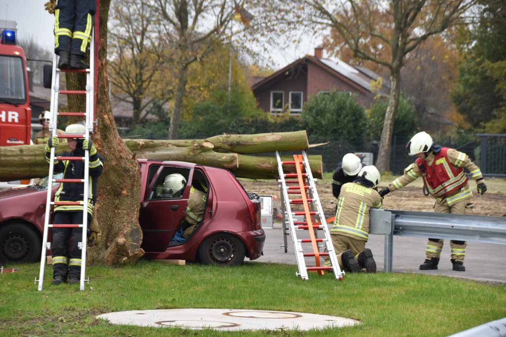 Hier ist ein PKW gegen einen Baum gefahren, zwei Personen sind eingeklemmt und schwer verletzt. Durch den Aufprall ist die obere Hälfte des Baumes auf dem PKW gefallen. Das Fahrzeug muss sofort Stabilisiert werden und der Baum entfernt werden, hier werden Hebekissen zum anheben des Baumes eingesetzt. Weitere Einsatzkräfte müssen für die Sicherung der Unfallstelle und Absicherung gegen weitere Gefahren eingesetzt werden. Die Kräfte müssen mit einer Seilwinde den PKW aus dem Gefahrenbereich unter dem Baum wegziehen und anschließend mit der Rettung der Verletzten beginnen. Das das Fahrzeug anfängt zu brennen muss eine sofortige Brandbekämpfung erfolgen. Die Verletzten werden sofort medizinisch betreut und in umliegende Krankenhäuser gebracht.