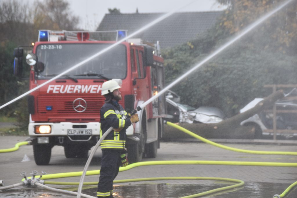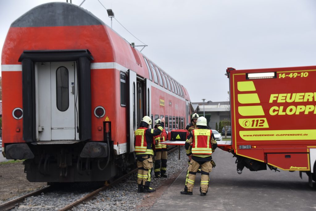 Am frühen Nachmittag bricht ein Feuer im Übungsturm der Feuerwehrtechnischen Zentrale in Cloppenburg aus. Aufgrund von starker Windentwicklung breitet sich der Brand schnell auf umliegende Vegetationsflächen und das nahegelegene Einfamilienhaus aus. Zudem ereignet sich im selben Zeitraum ein schwerer Unfall auf der einspurigen Gleisanlage, bei dem ein PKW unter einem umgestürzten Baum eingeklemmt wurde. Mehrere Personen werden vermisst und es ist unklar, ob sie sich noch in den Gebäuden oder Fahrzeugen befinden. Eine umfangreiche Wasserförderung und -transport sowie technische Rettung sind notwendig, um die Lage zu bewältigen.