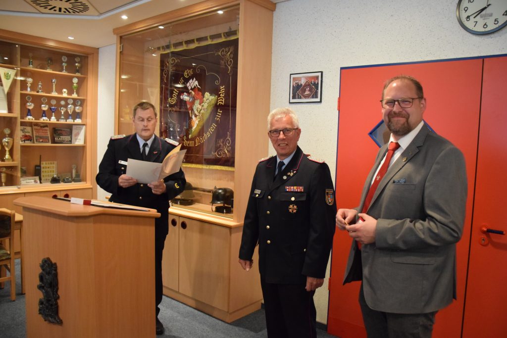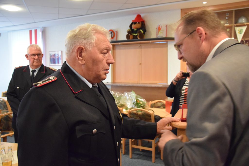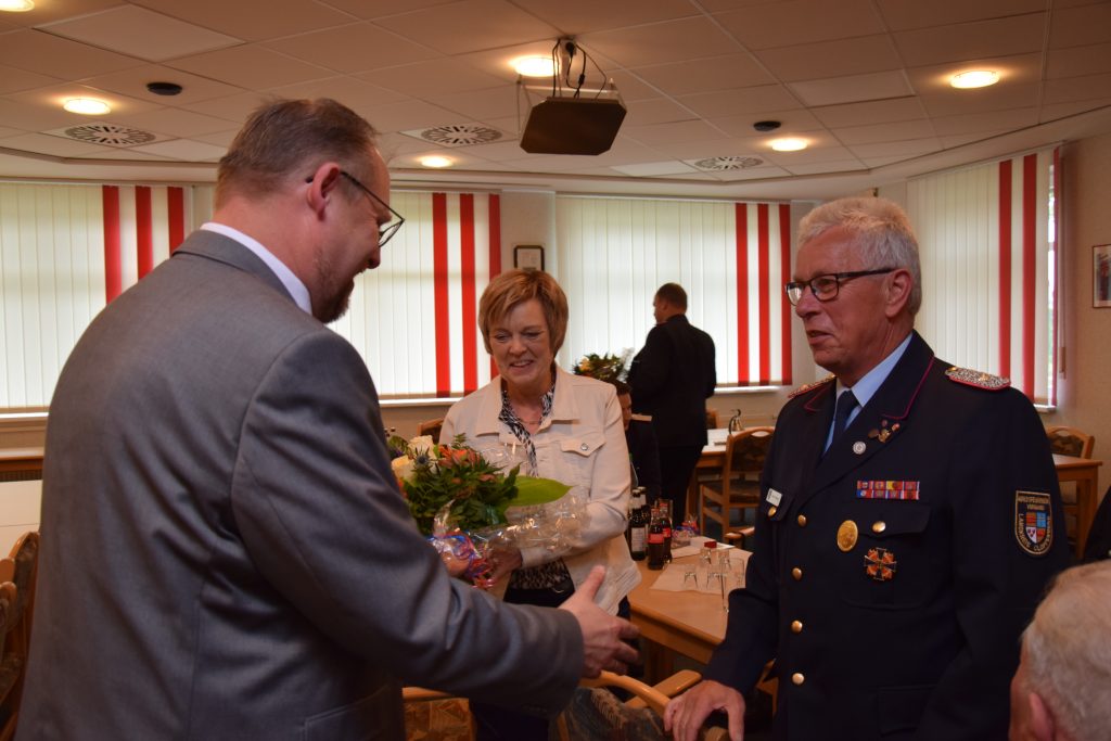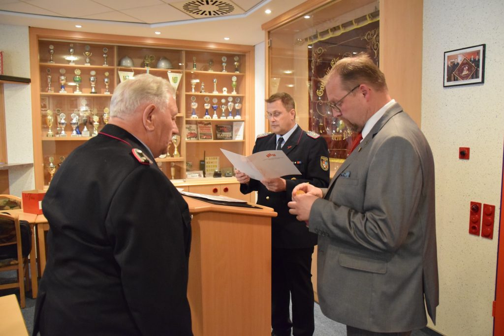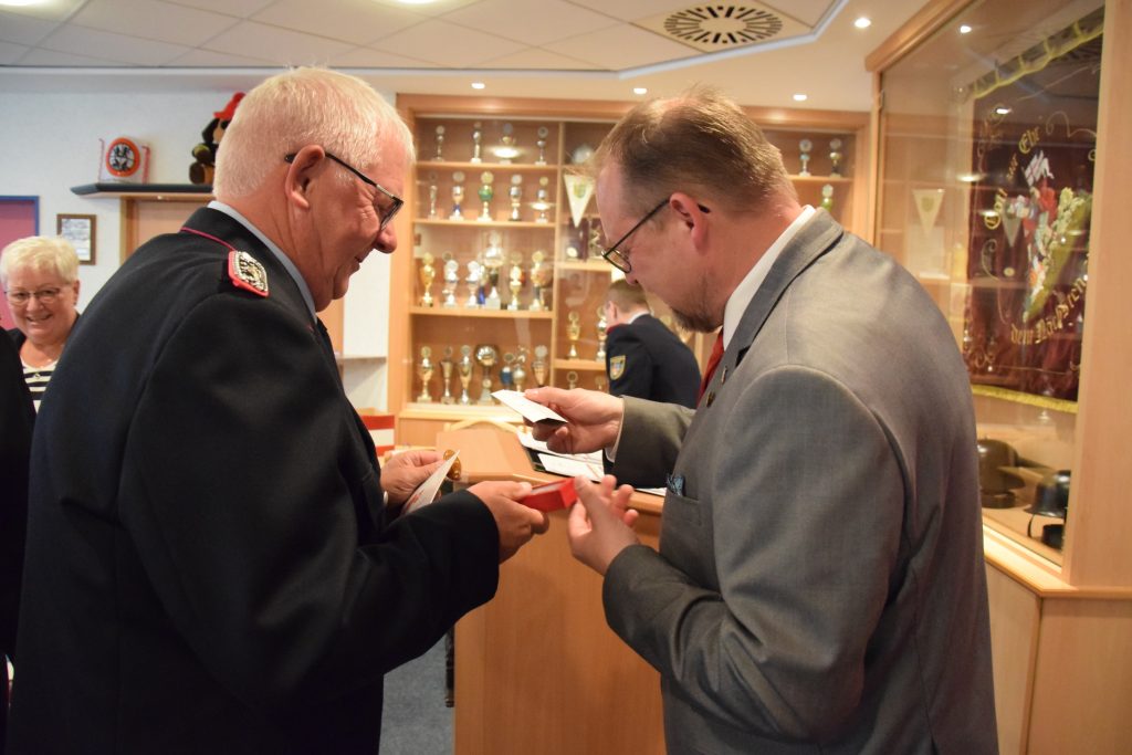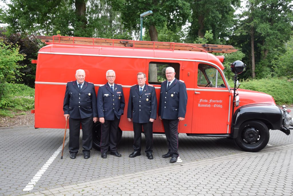 Ramsloh (LK Cloppenburg) – Für ihre jeweils 50-jährige Mitgliedschaft in der Freiwilligen Feuerwehr Ramsloh wurden am Freitag, den 25.06.2021 in einer kleinen Feierstunde im Feuerwehrhaus Ramsloh die Kameraden Johann Schulte, Bernhard Kruse, Heinrich Oltmanns und Bernhard Geesen mit einer Urkunde und einer Anstecknadel des Landesfeuerwehrverbandes Niedersachsen geehrt. Neben Ortsbrandmeister Matthias Schulte und seinem stellv. Ortsbrandmeister Timo Hinrichs, dem Gemeindebrandmeister Rolf Tebben, Gemeindepressewart Thomas Giehl, Thomas Otto Bürgermeister der Gemeinde Saterland, gratulierte auch der Kreisfeuerwehrverband Cloppenburg, vertreten durch Kreisbrandmeister Arno Rauer den vier Geehrten. Die Urkunde und die Anstecknadel des Landesfeuerwehrverbandes Niedersachsen, so KBM Arno Rauer, werden verliehen als Dank und in Anerkennung für 50-jährige Mitgliedschaft in der Freiwilligen Feuerwehr. Ein Dank ging an Bürgermeister Thomas Otto und dem Rat der Gemeinde Saterland, der voll und ganz hinter der Feuerwehr Saterland steht. Er bedankte sich nochmals bei GBM Rolf Tebben für seine 12-jährige Amtszeit als Gemeindebrandmeister, diese endet am 30.06.2021. Auch Ortsbrandmeister Matthias Schulte würdigte das ehrenamtliche Engagement der vier Kameraden, die einen großen Wandel der Feuerwehr in den letzten Jahrzehnten miterlebt und vor allem mitgestaltet haben. Ihr seid und wart für alle Kameradinnen und Kameraden immer ein Vorbild. Für sie alle ist und war die Feuerwehr mehr als nur ein Feuer zu löschen. Denn Feuerwehr ist Engagement, Gemeinschaft, Hilfsbereitschaft und soziale Verantwortung. Ortsbrandmeister Matthias Schulte und sein Stellvertreter Timo Hinrichs überreichten ein kleines Präsent von den Kameraden der Freiwilligen Feuerwehr Ramsloh. Bürgermeister Thomas Otto sagte in seiner Laudatio, ohne das ehrenamtliche Engagement der Kameradinnen und Kameraden funktioniert die Feuerwehr nicht, man kann auf die Einsatzkräfte der Feuerwehren Ramsloh und Scharrel stolz sein. Ich bin froh und sehr dankbar, an dem heutigen Abend dabei zu sein zu dürfen, so Otto. Er überreichte den Geehrten einen Gutschein und den Frauen einen Blumenstrauß. Auch Rolf Tebben, Gemeindebrandmeister der Freiwilligen Feuerwehr Saterland gratulierte den Jubilaren im Namen der aller Kameradinnen und Kameraden der Feuerwehr Saterland. Ich durfte Euch fast 35 Jahre begleiten, darauf bin ich stolz, so Tebben. Alle anwesenden Gäste wünschten den Jubilaren alles Gute für Ihre weitere Zukunft. Nach der Feierstunde wurden noch einige Anekdoten aus der Feuerwehr von den Jubilaren erzählt, hier wurde noch viel gelacht und geschmunzelt.