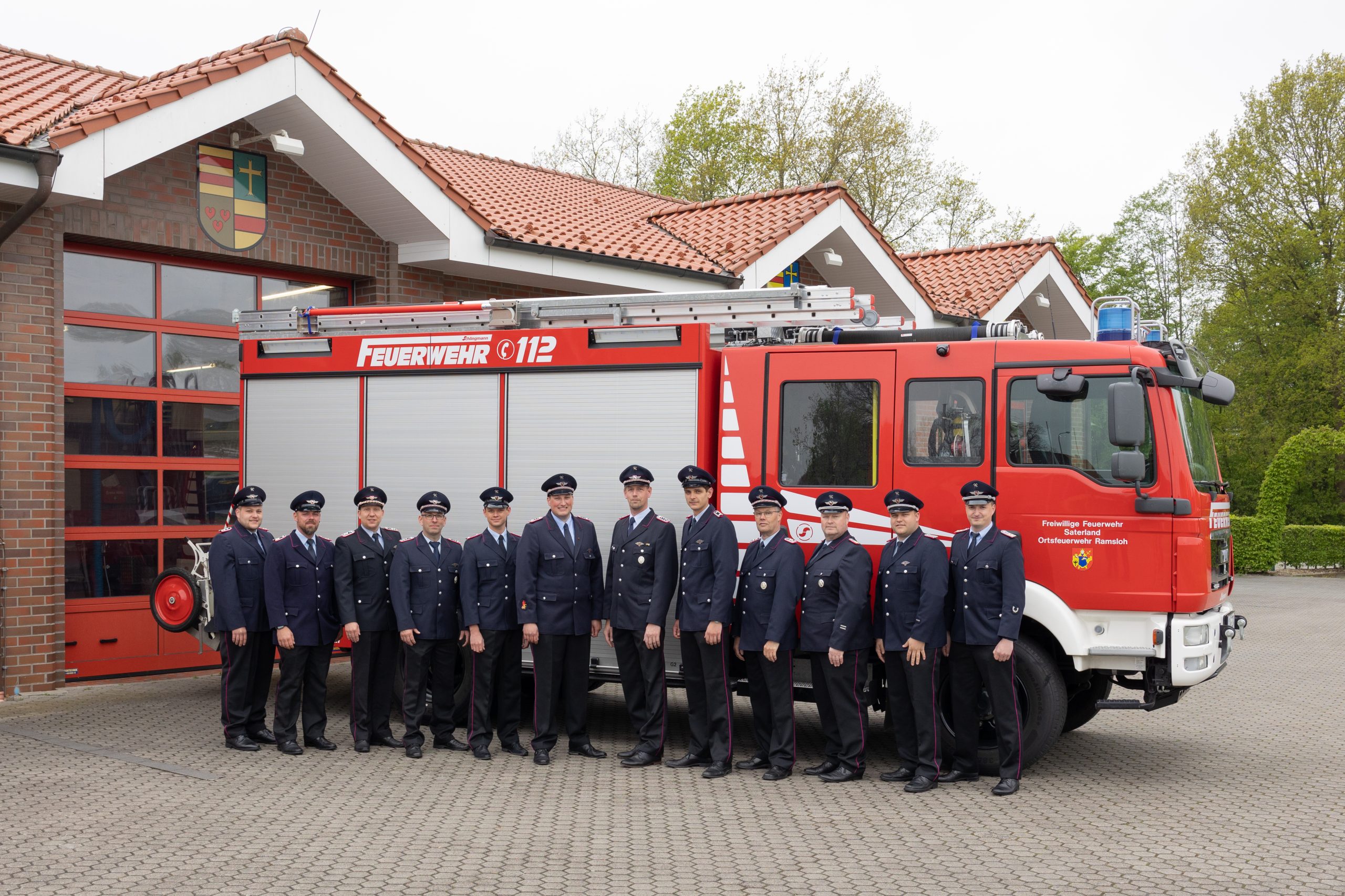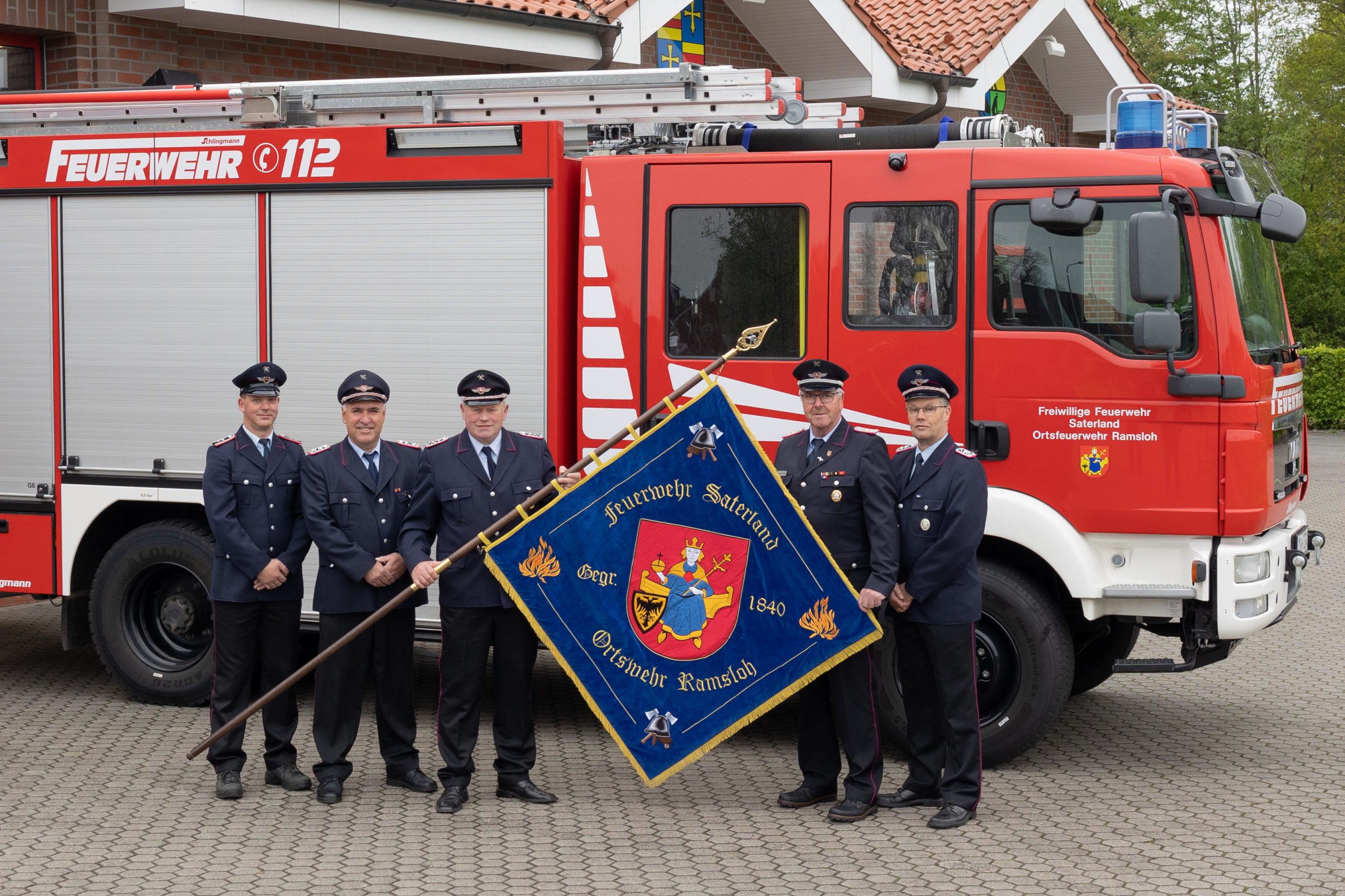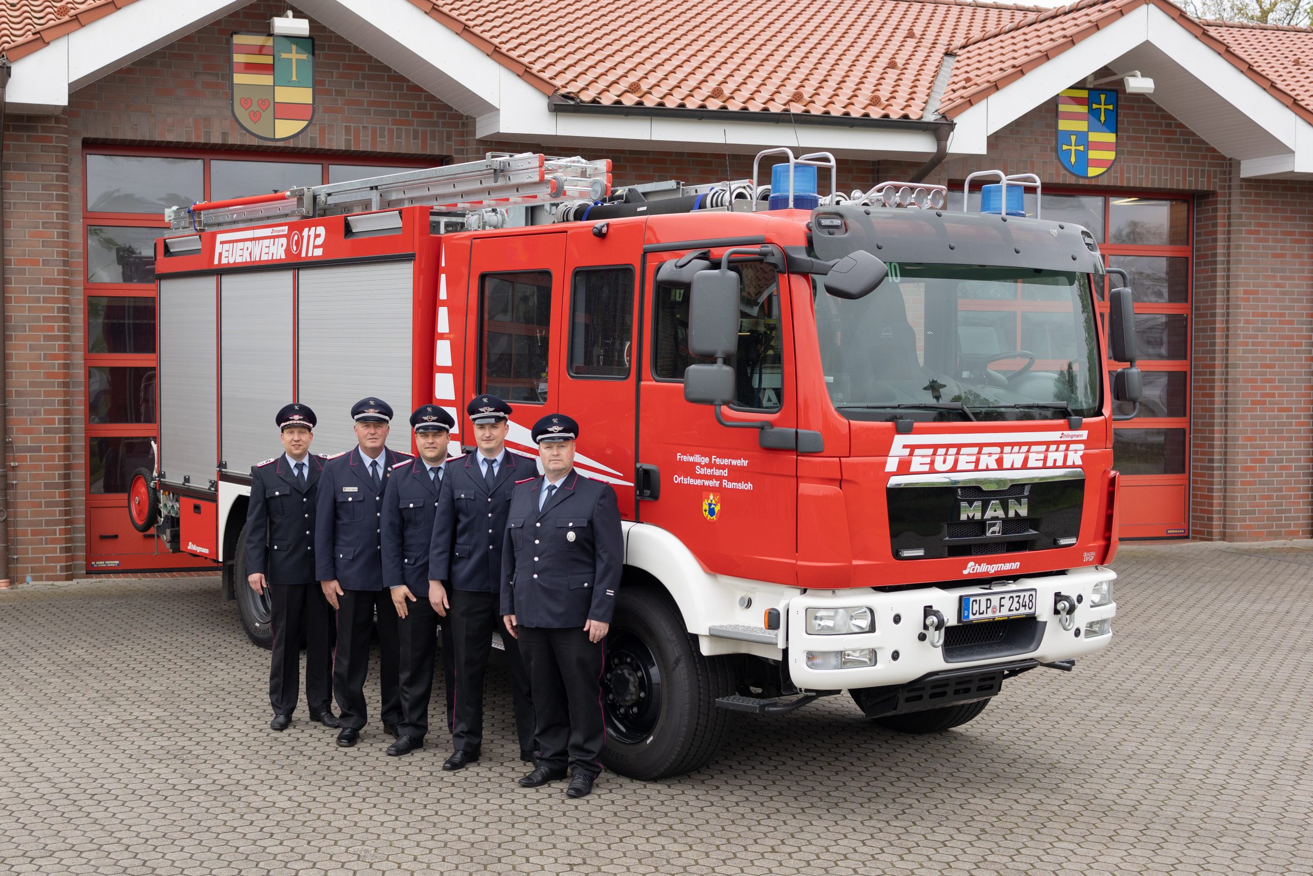 v.l.n.r.: Zugführer Heiko Sobing, Stellv. Zugführer Rolf Tebben, Stellv. Ortsbrandmeister Timo Hinrichs, Ortsbrandmeister Matthias Schulte, Stellv. Gemeindebrandmeister Kevin Heese