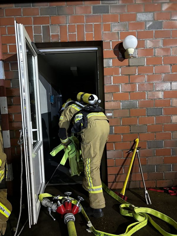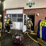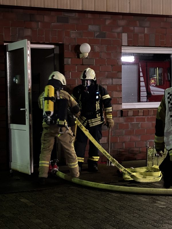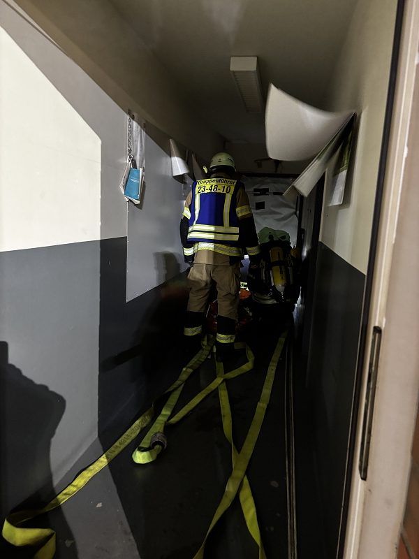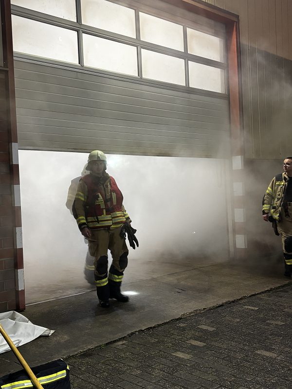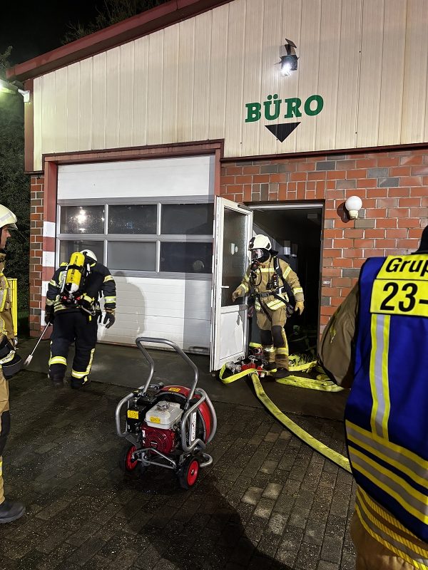 Beim Eintreffen der Einsatzkräfte drang bereits dichter Rauch aus der Halle. Sofort gingen vier Trupps unter Atemschutz zur Menschenrettung und Brandbekämpfung vor. Aufgrund der starken Verrauchung gestaltete sich die Suche nach den vermissten Personen schwierig, dennoch konnte sie zügig gefunden und dem Rettungsdienst übergeben werden.