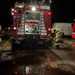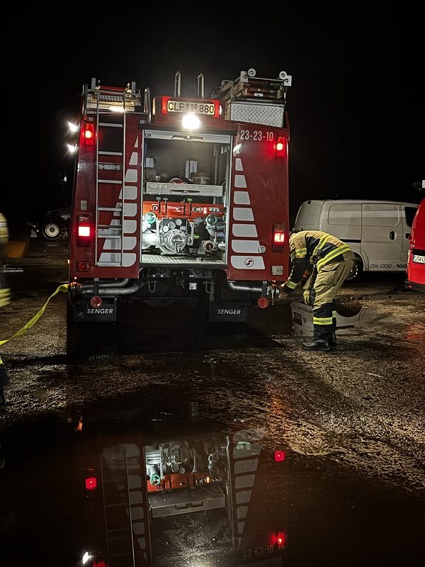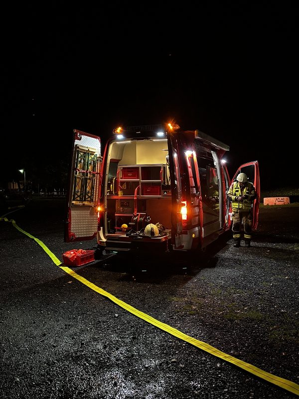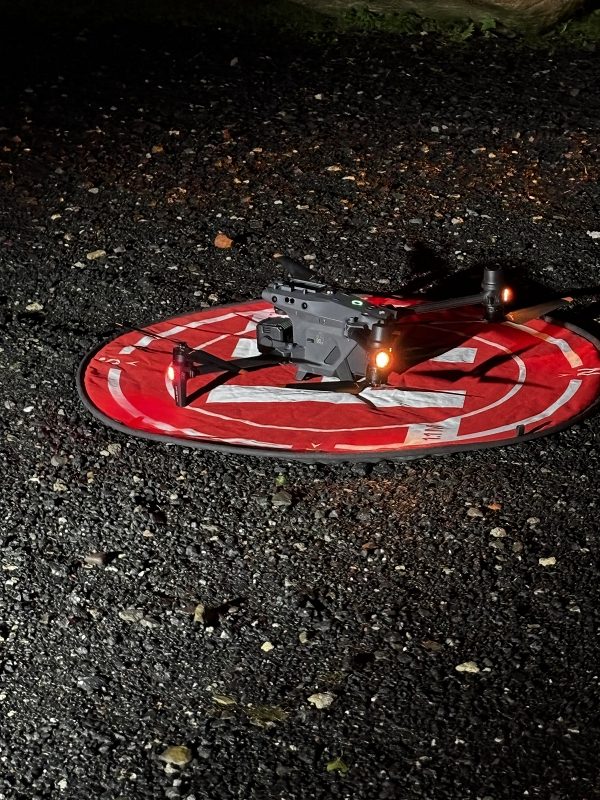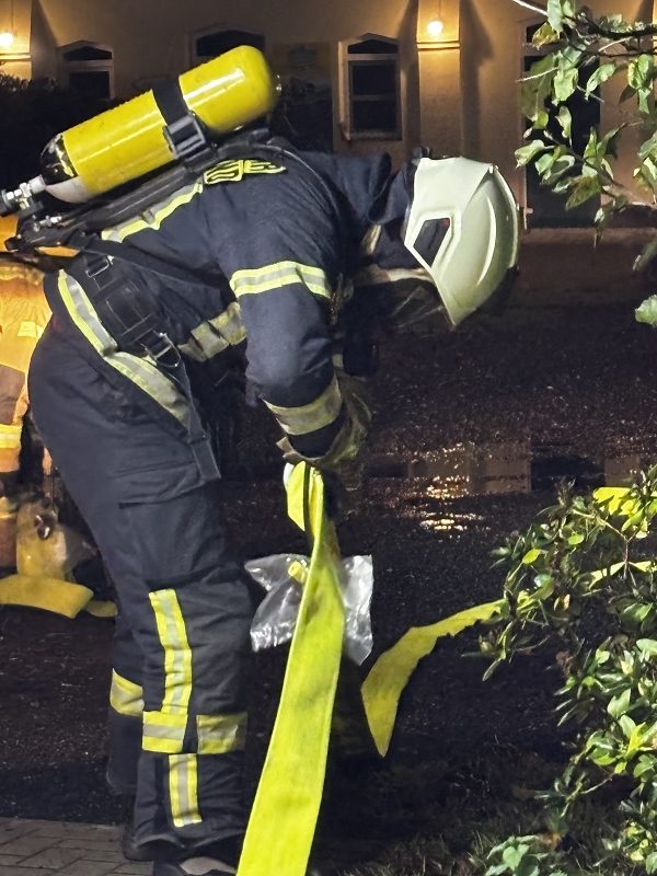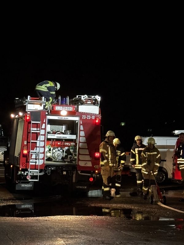 Parallel wurde eine rund 350 Meter lange Wasserversorgung durch unseren GW-L2 und weitere Einsatzkräfte aufgebaut. Um ein Übergreifen der Flammen auf benachbarte Hallen zu verhindern, errichteten weitere Kameradinnen und Kameraden eine Riegelstellung. Unterstützt wurde der Einsatz durch die Drohne der Feuerwehr Saterland, die wertvolle Luftaufnahmen zur Lageeinschätzung lieferte.